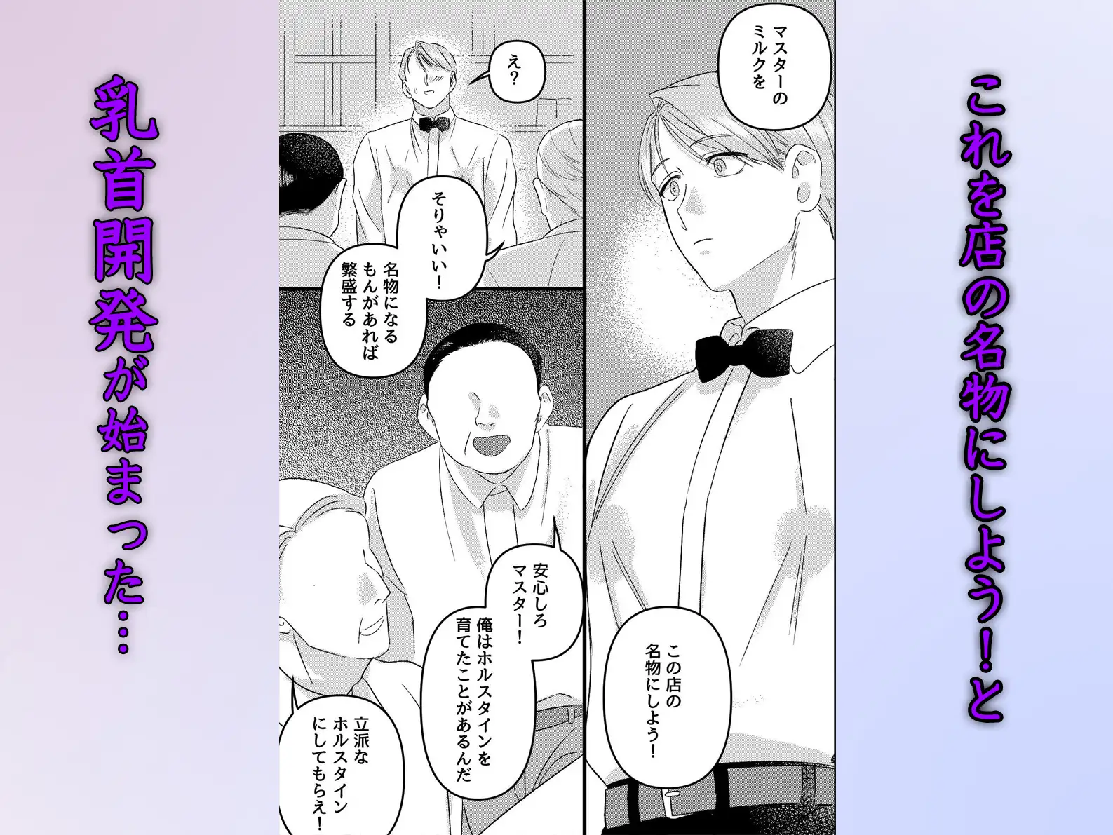 「これを店の名物にすれば絶対繁盛する!」と搾乳開発が始まった。最初は手動搾乳器で乳首を引っ張られ、平らだった胸を入念に揉みほぐされる。