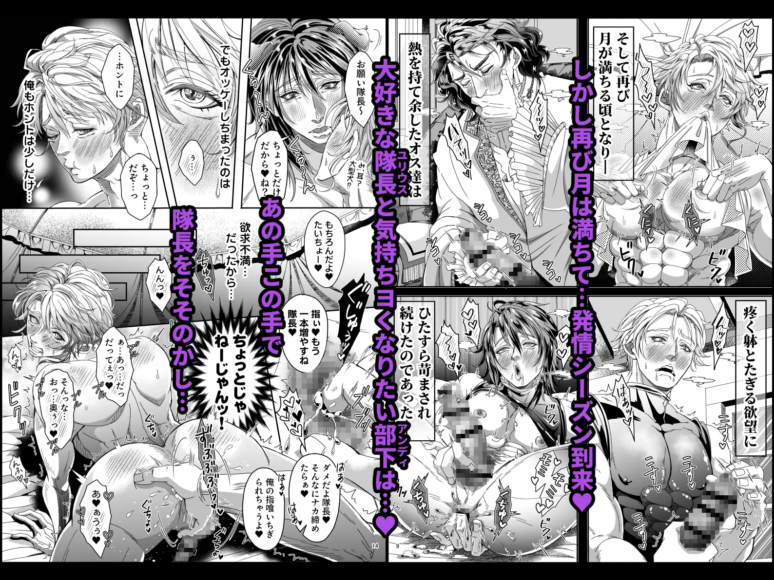 骨の髄まで欲望にまみれ快楽と精液に溺れたあの大乱交事件から一ヶ月…。男達はとある理由からセックスを禁止され厳しい禁欲生活を余儀なくされていた。この辺境の砦に長逗留を続ける王子マキシミリアン、雇われ傭兵のユリウスとその部下パットとアンディ。獣人の雄である4人にとってひと月にも渡る禁欲は想像以上に耐え難い。そして再び月は満ちて満月の頃となり…発情のシーズンが到来!!性欲MAX極限まで我慢し続けた男達がこれ以上辛抱出来るはずもなく…可愛い部下からの誘いを断り切れない優柔不断な隊長ユリウスと、大好きな隊長を前にすっかり雄の本能を取り戻したアンディ。二人でこっそり楽しむつもりがどんどん行為はエスカレートして…。とうとう『挿れたい』と言い出してしまうアンディ!オモチャで散々弄られたユリウスの躰はすっかり蕩けてもう他の男のペニスを拒めない。ユリウスの肛門に押し当てられたアンディの先端がメリッと鈍い音を立てて熱い内部に押し入っていく…