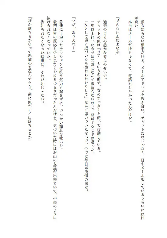 性別を女と偽り始めたチャットで、顔も知らない男と仲良くなり、その男に恋に落ちてから一年以上が経過した。
