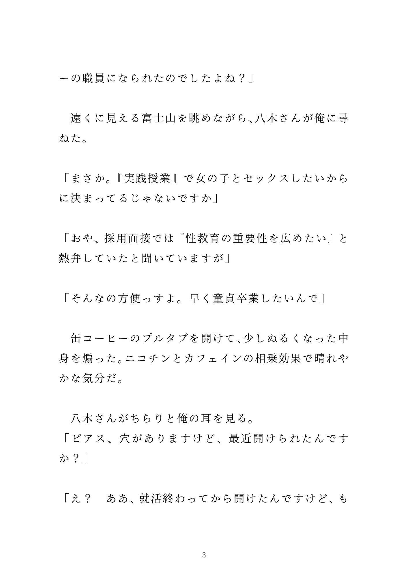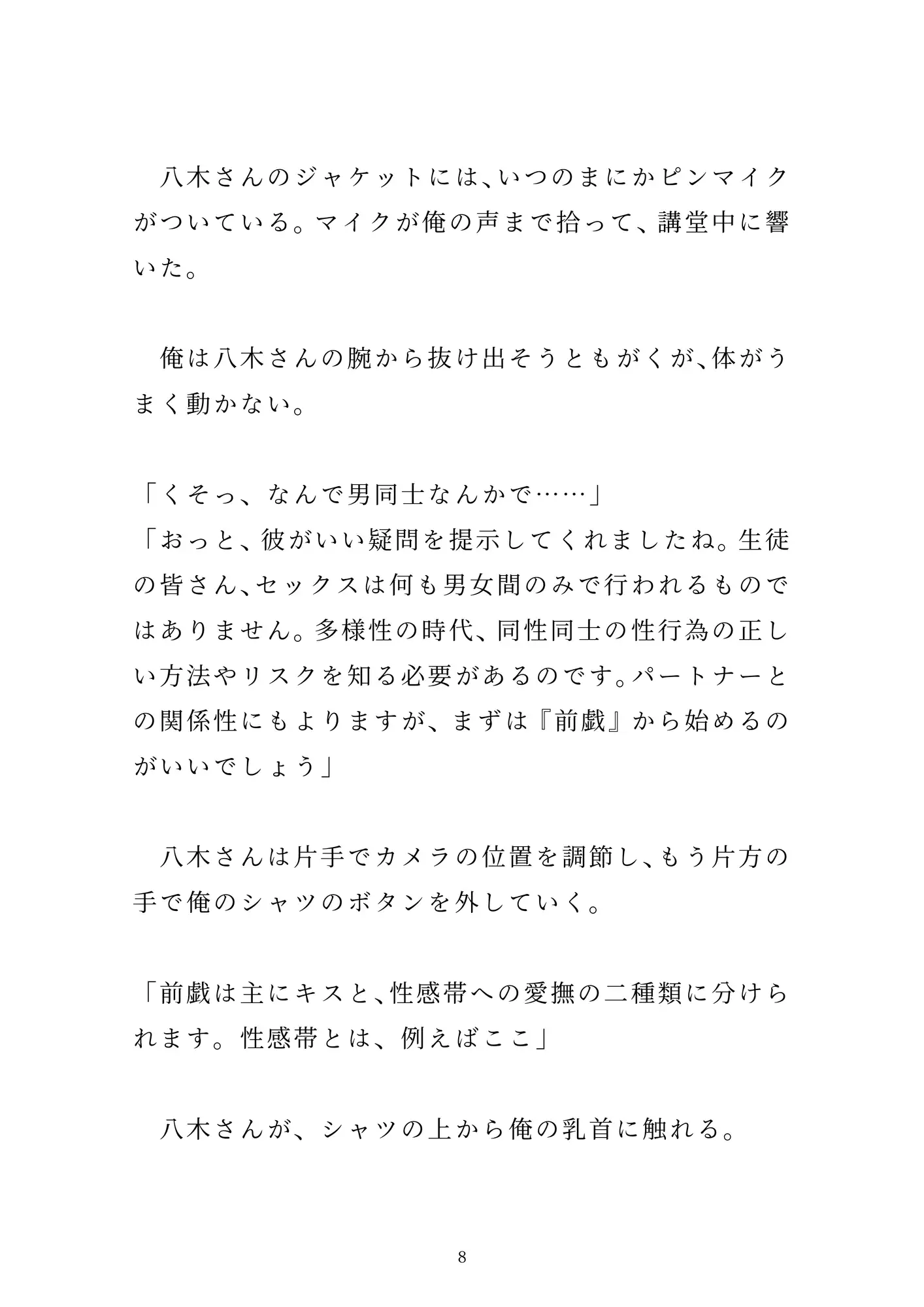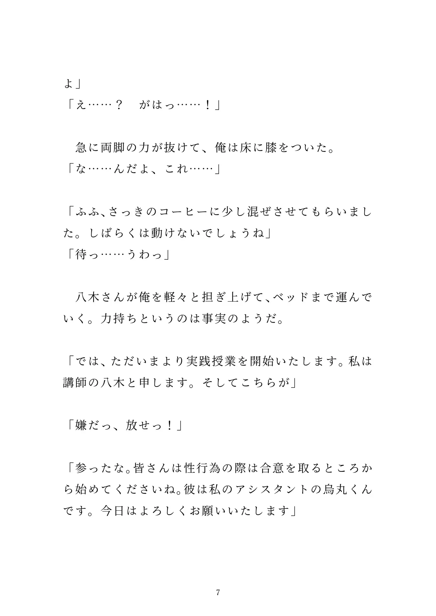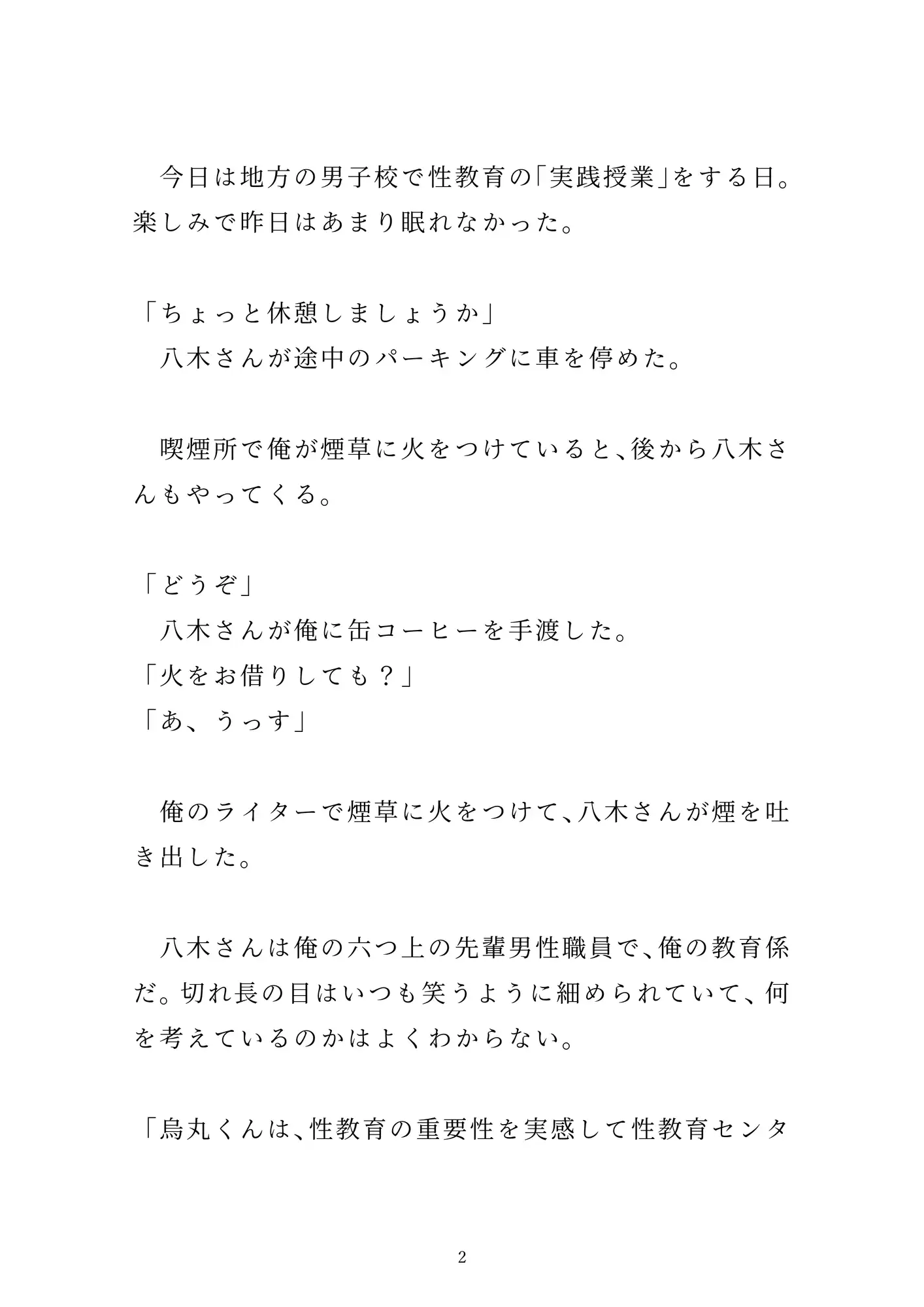 「女の子とのセックス」を夢見て新卒で「性教育センター」の職員になった烏丸。とある男子校での実践授業で、先輩男性職員の八木さんに一服盛られて、百名の生徒たちの前で公開セックスさせられる。