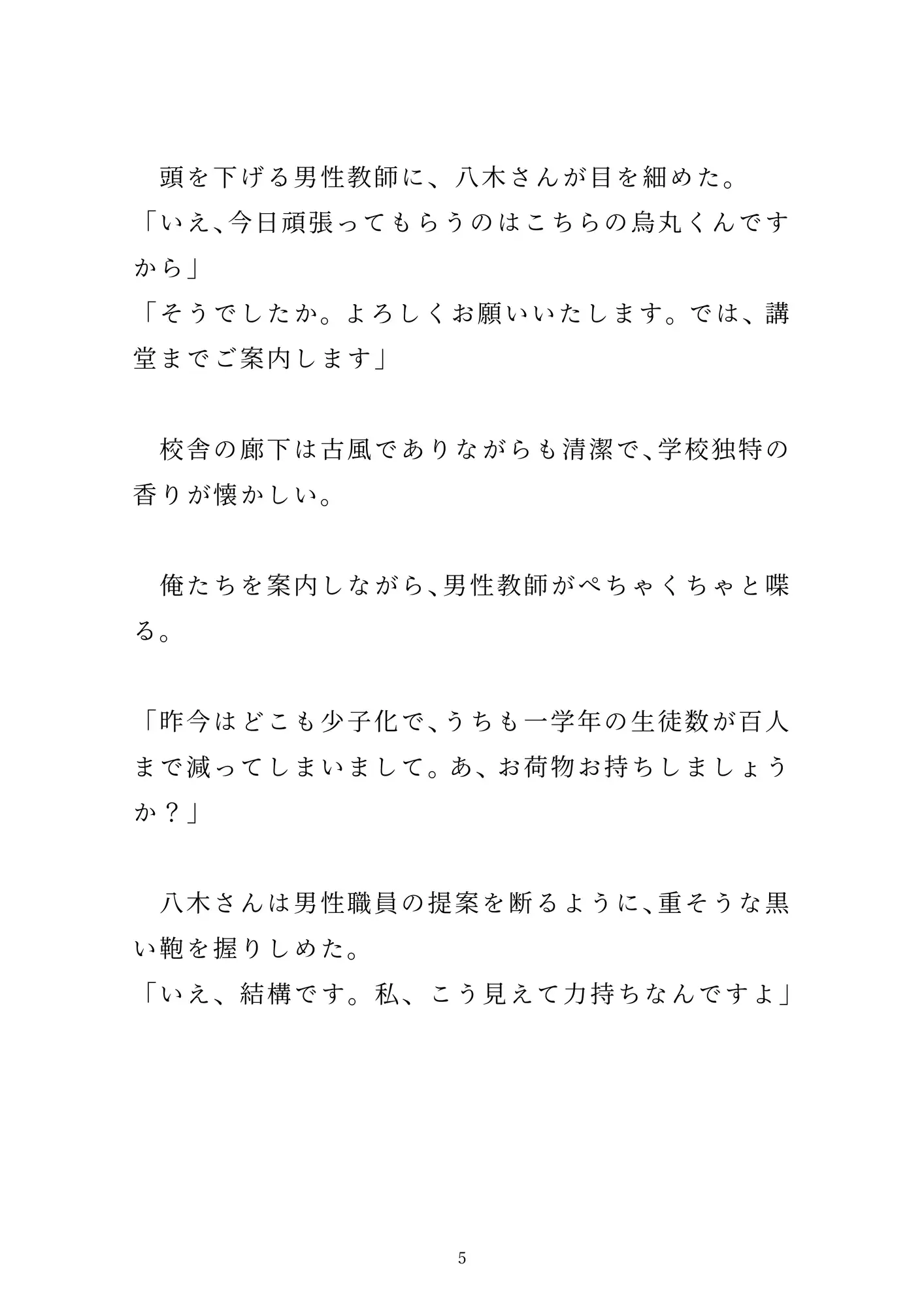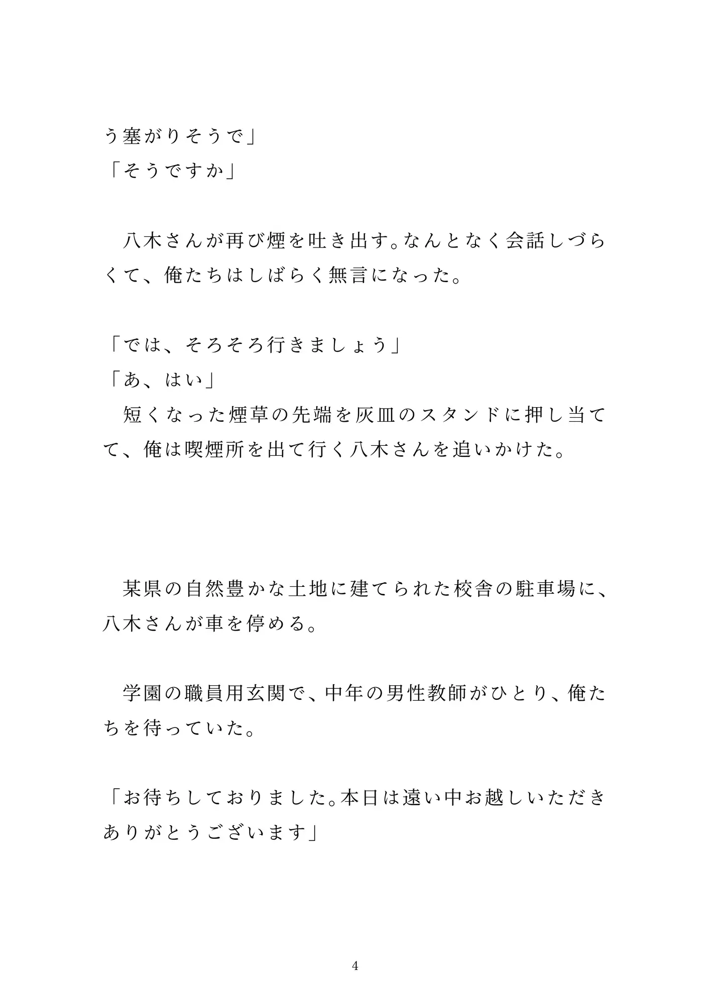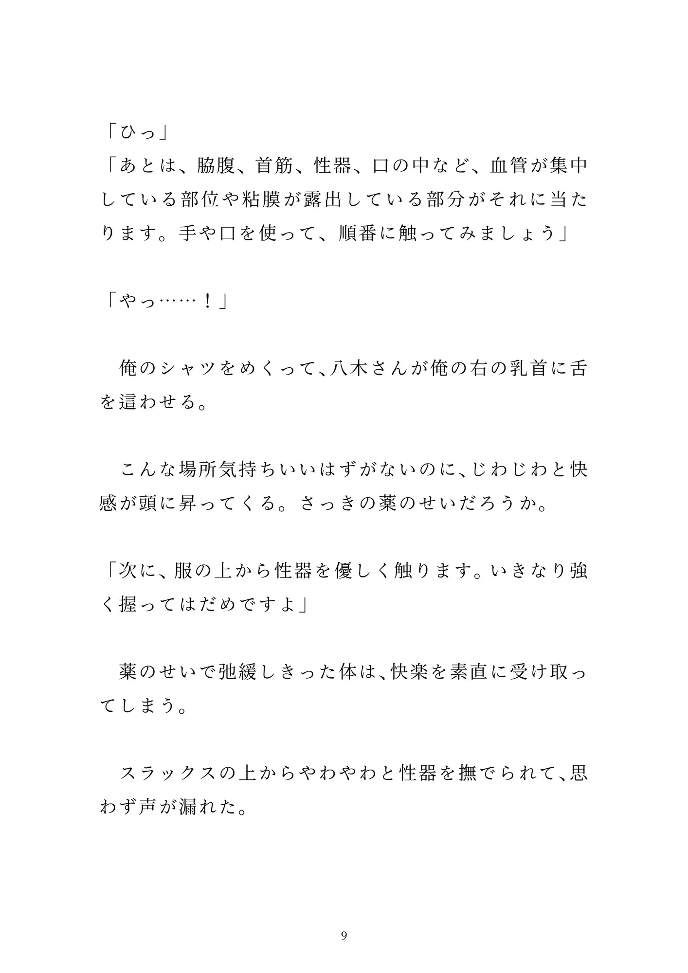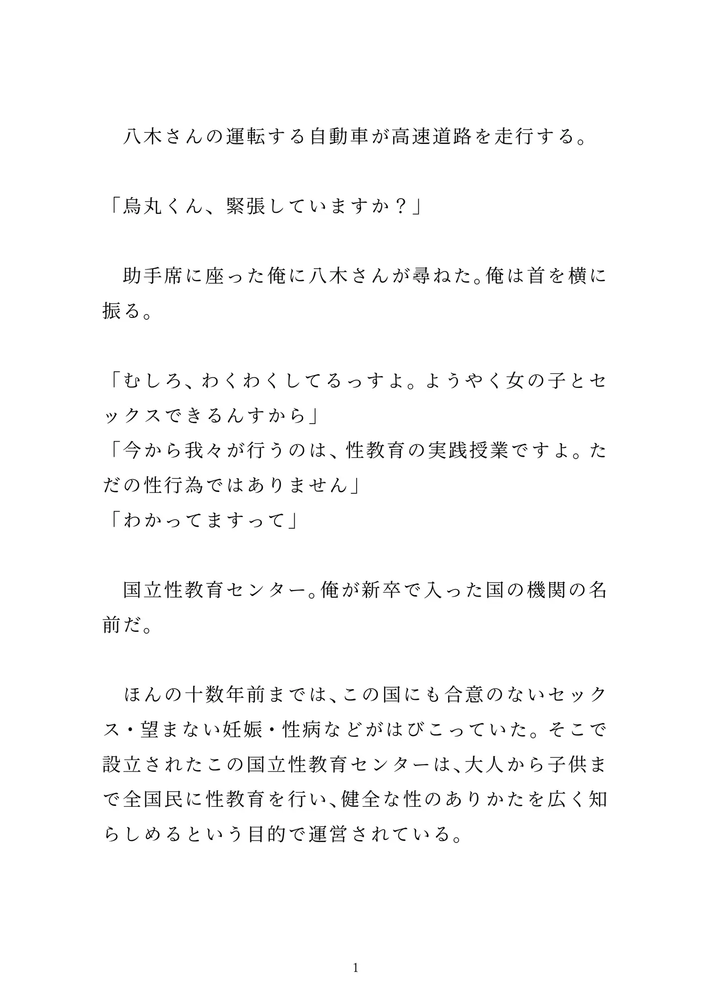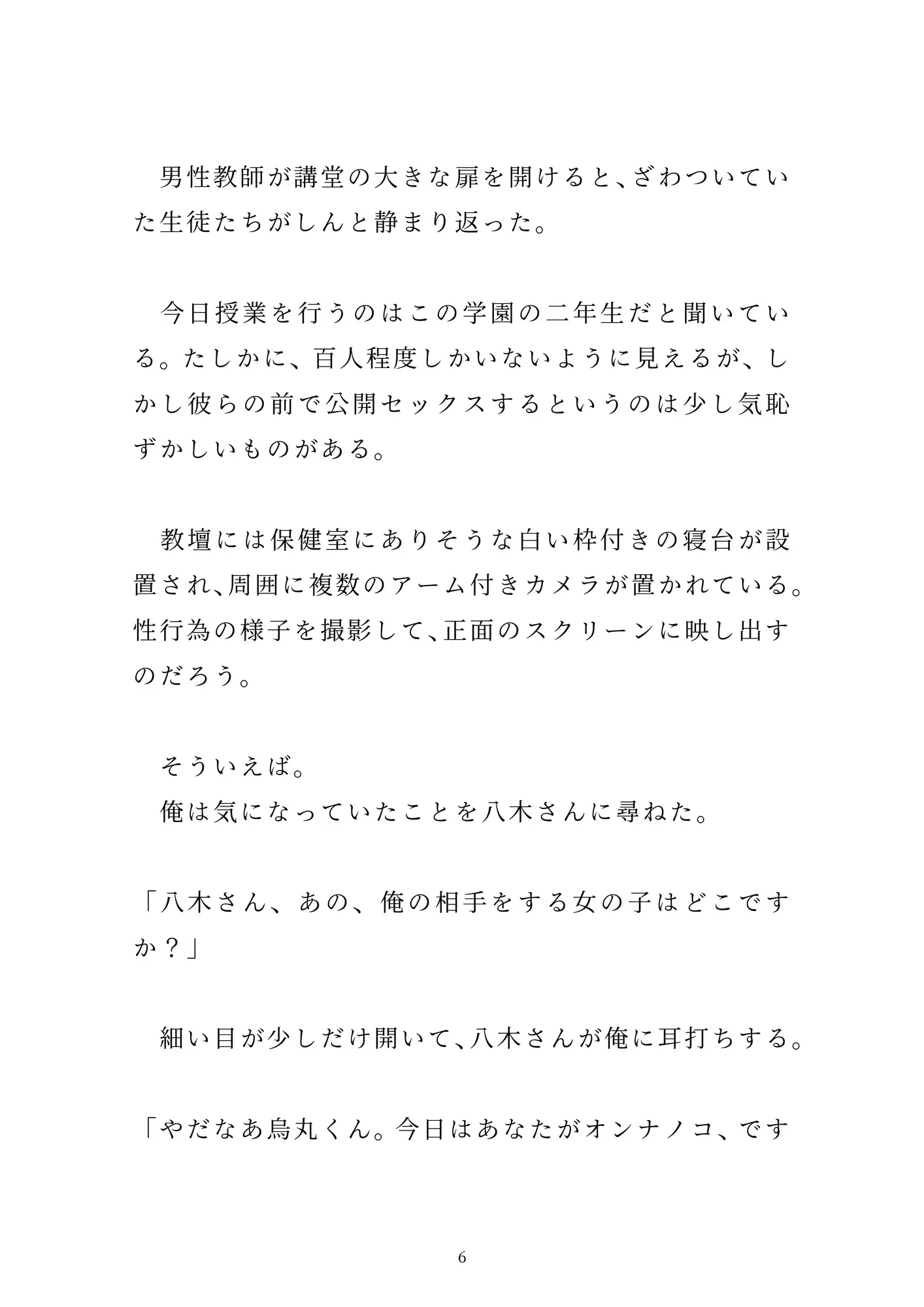 「女の子とのセックス」を夢見て新卒で「性教育センター」の職員になった烏丸。とある男子校での実践授業で、先輩男性職員の八木さんに一服盛られて、百名の生徒たちの前で公開セックスさせられる。