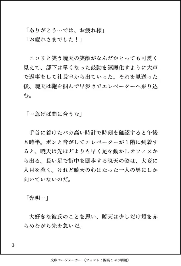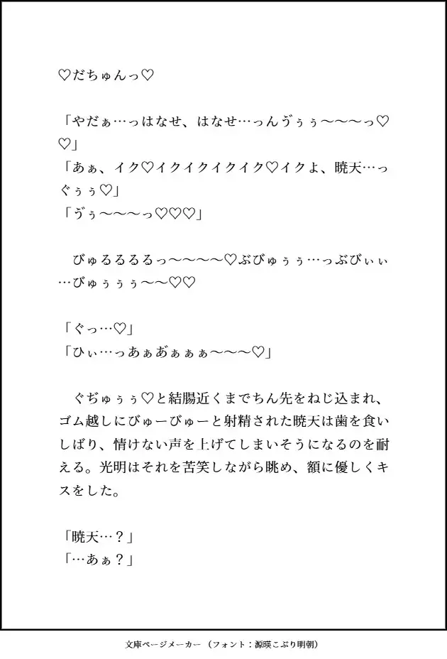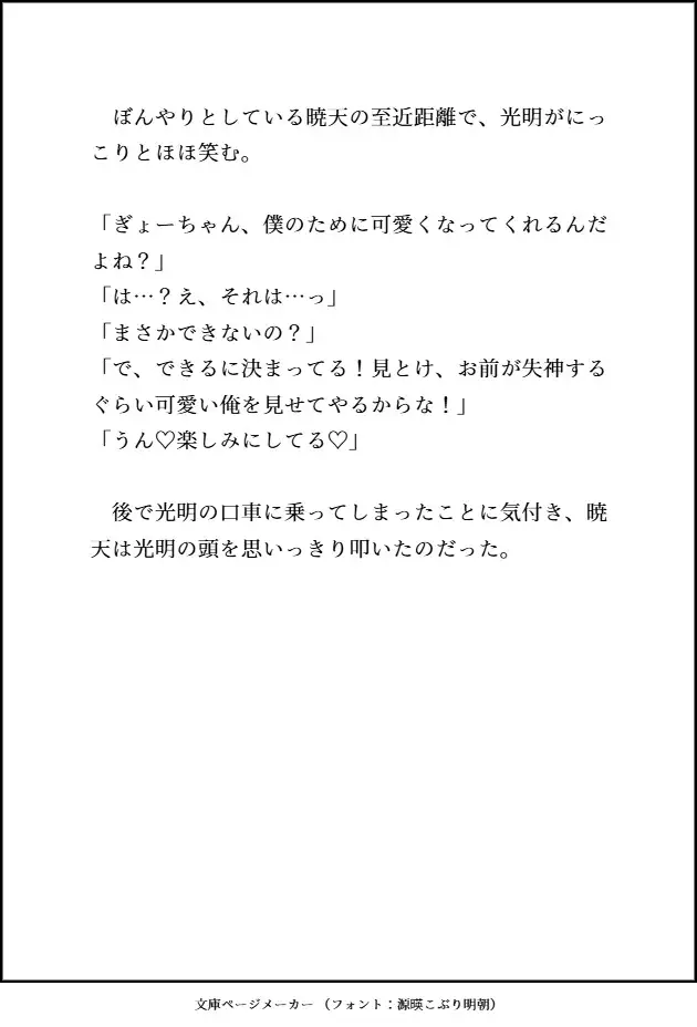 勘違いストーカーから助けてもらったことをきっかけに一目ぼれし、皇から告白。お付き合いを始めたが、ある日大好きな恋人が「可愛い子が好き」と言っているのを聞いたからさぁ、大変!可愛いからは程遠い暁天が、必死に可愛いを勉強してみるも、一枚上手な恋人にぐちゃぐちゃにエッチされてしまう。そんなこんなで仲良くしていたはずだけど、父親から電話がかかってきてから暁天の様子がおかしくなり…?