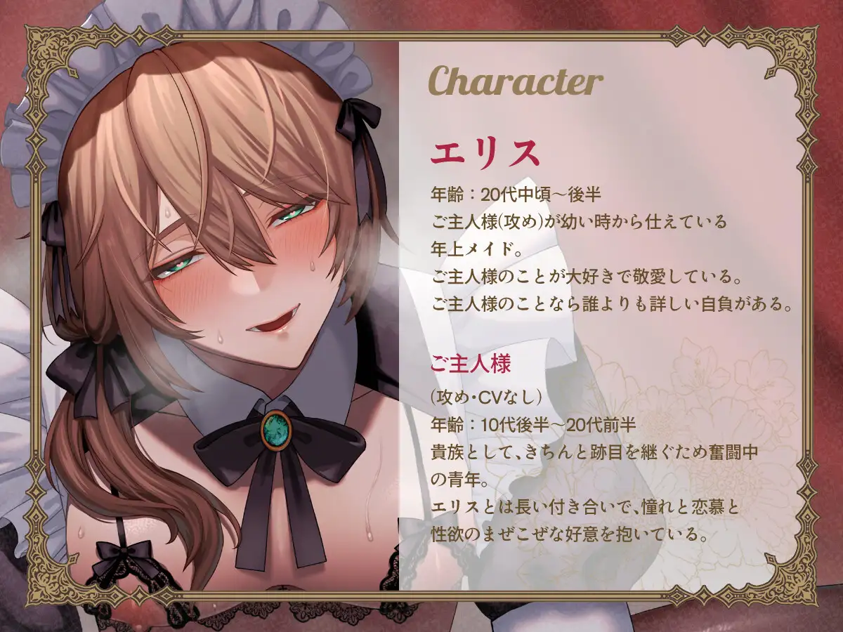 ご主人様のことが大好きで敬愛している。ご主人様のことなら誰よりも詳しい自負がある。◆ご主人様(攻め・CVなし)