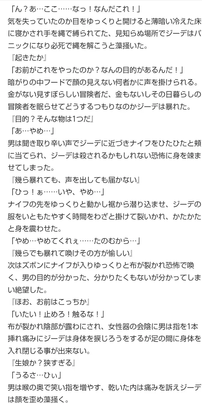 177センチ 薄い紫の瞳と髪の美形ジーデを襲った者:フードを被り声も顔も魔法で分からなくさせている 残虐性の強い存在 ジーデを徹底的に犯しつくす