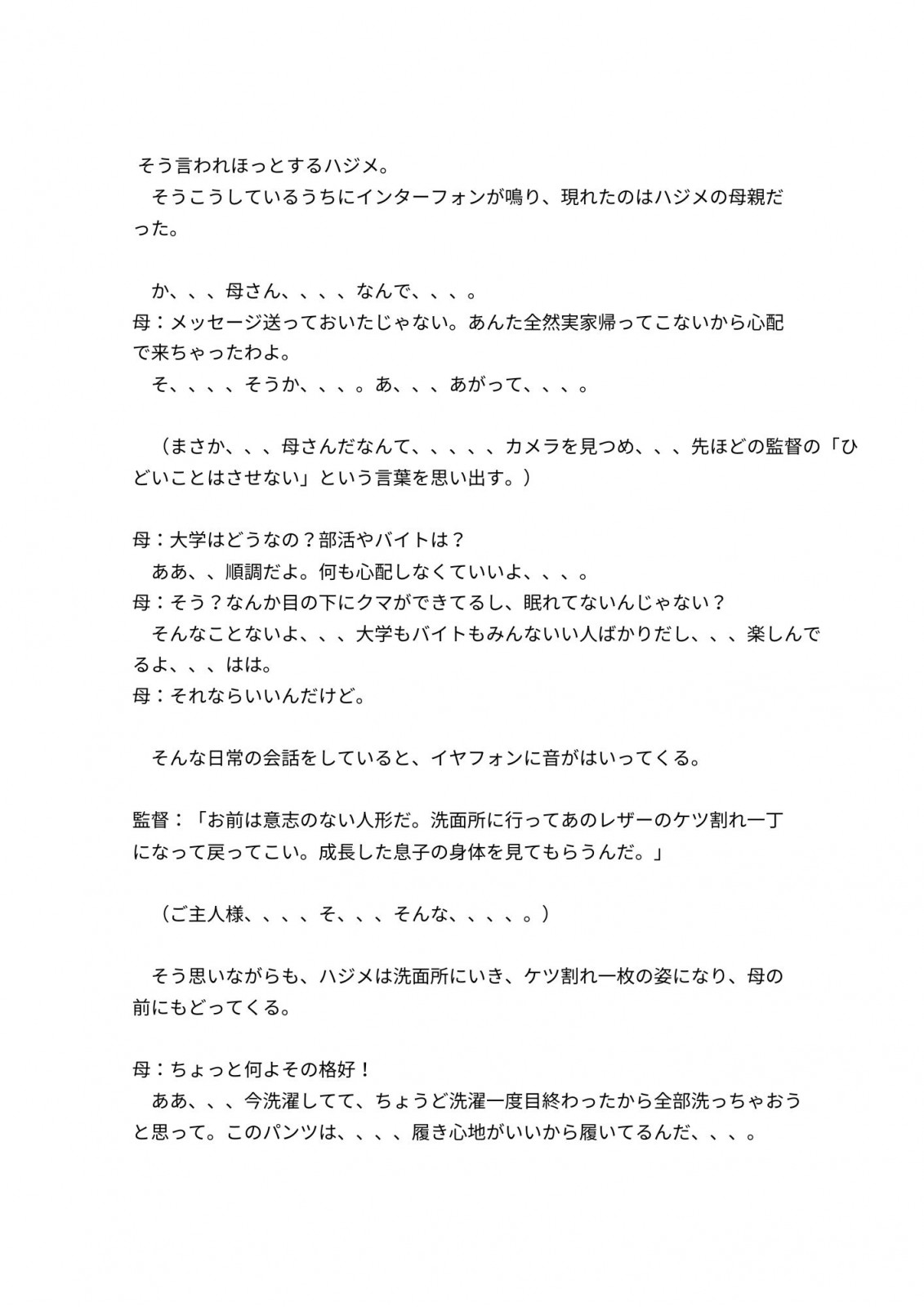 ハジメは撮られた写真や動画で脅されながら、後輩の橋本や羽田、親友の米田の前で奴○としてさらされたり、SMバーでのバイトの強要、知らない男たちに輪○され、おとされていった。本章でも過激露出、親友との絡み等背徳的なプレイでいじめられながらハジメは奴○として成長させられていきます。