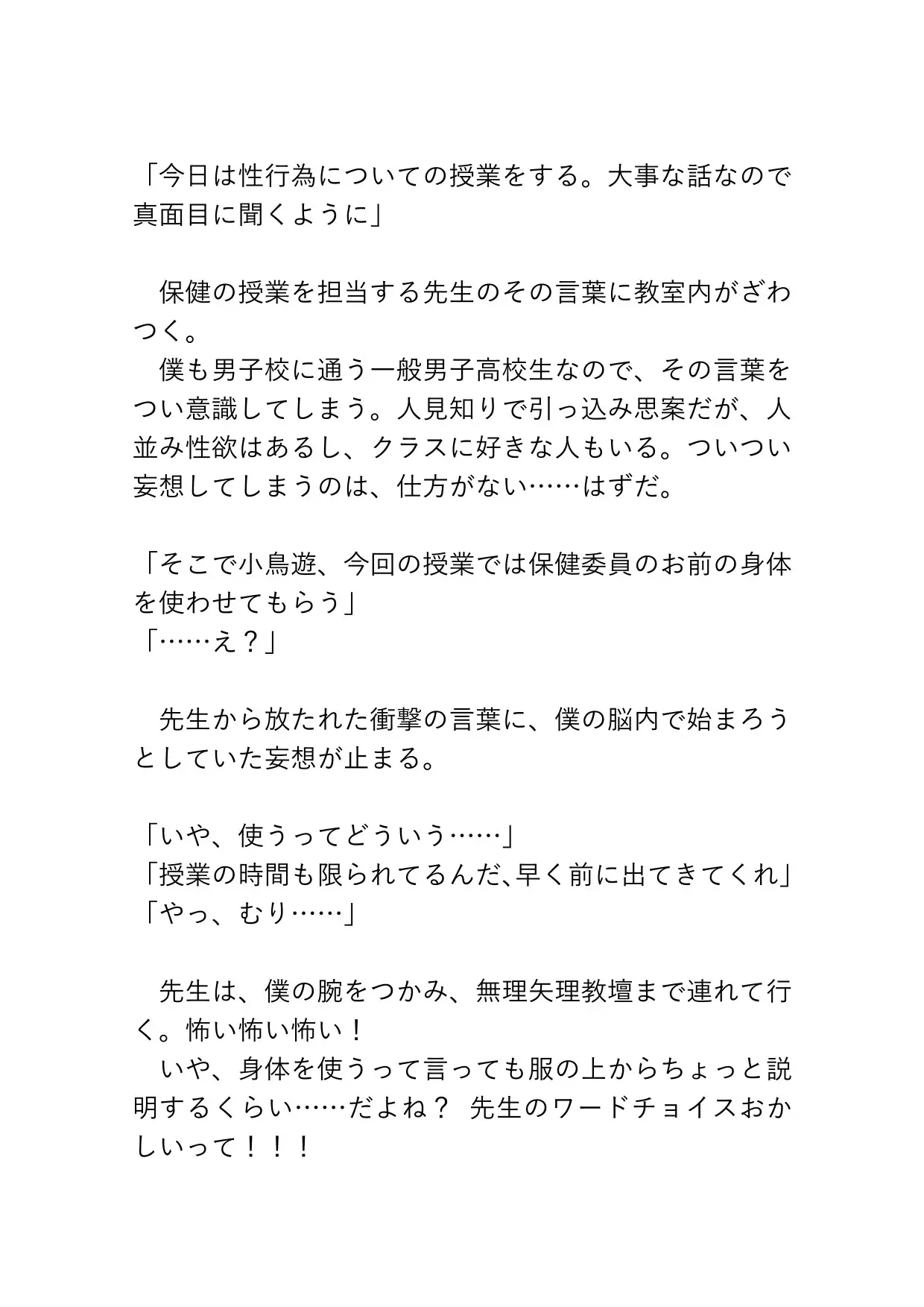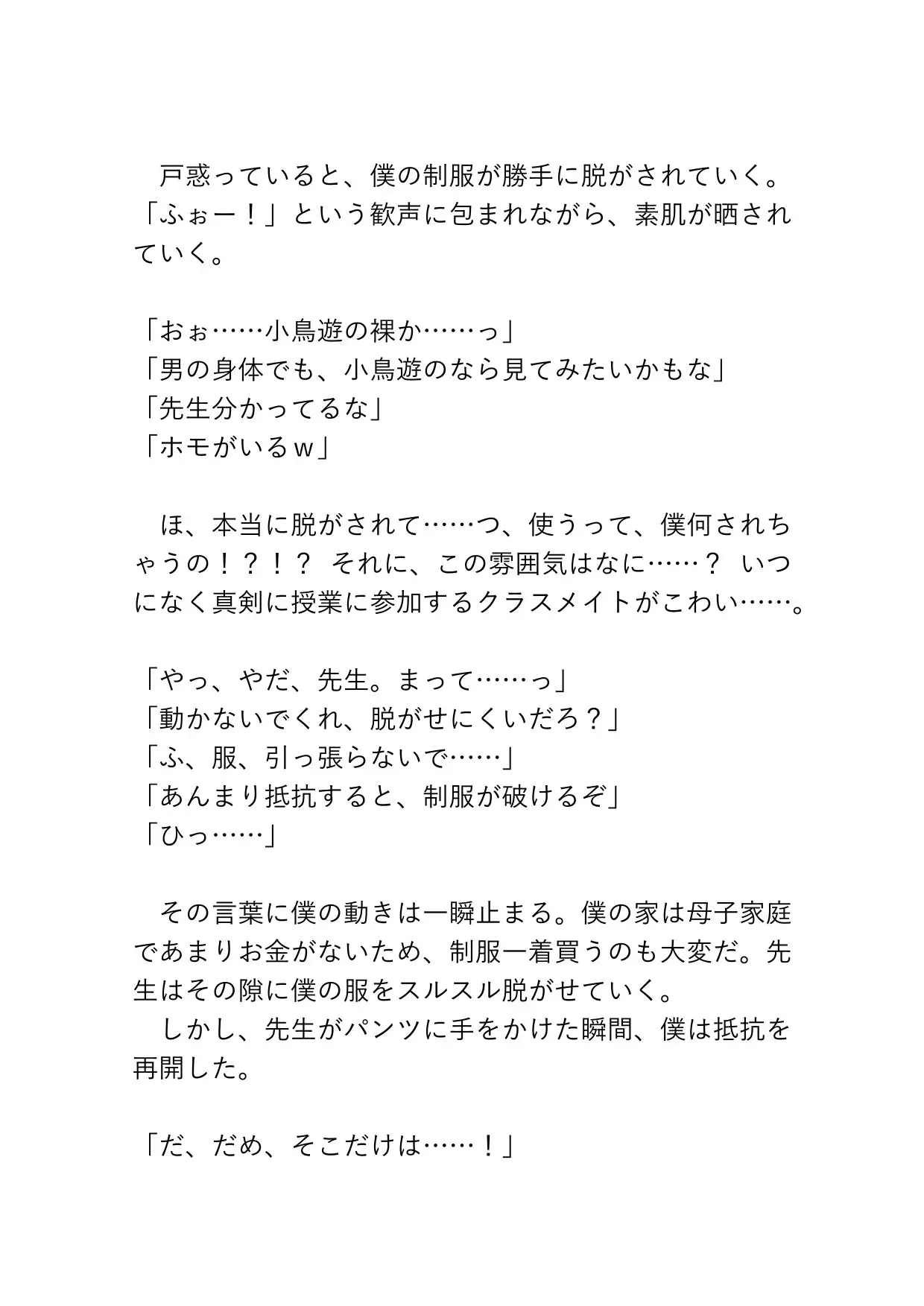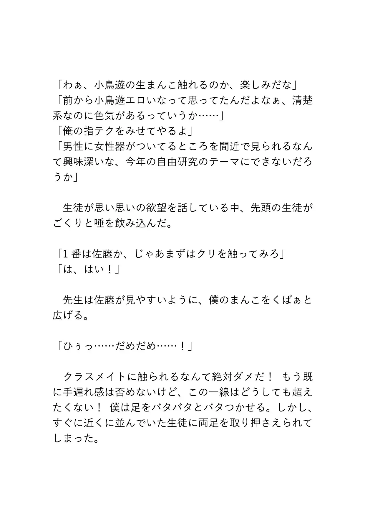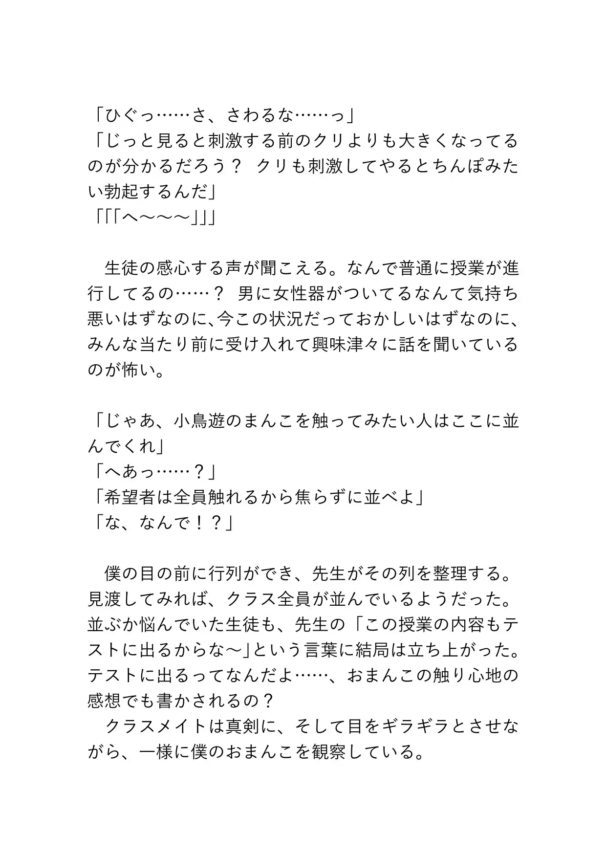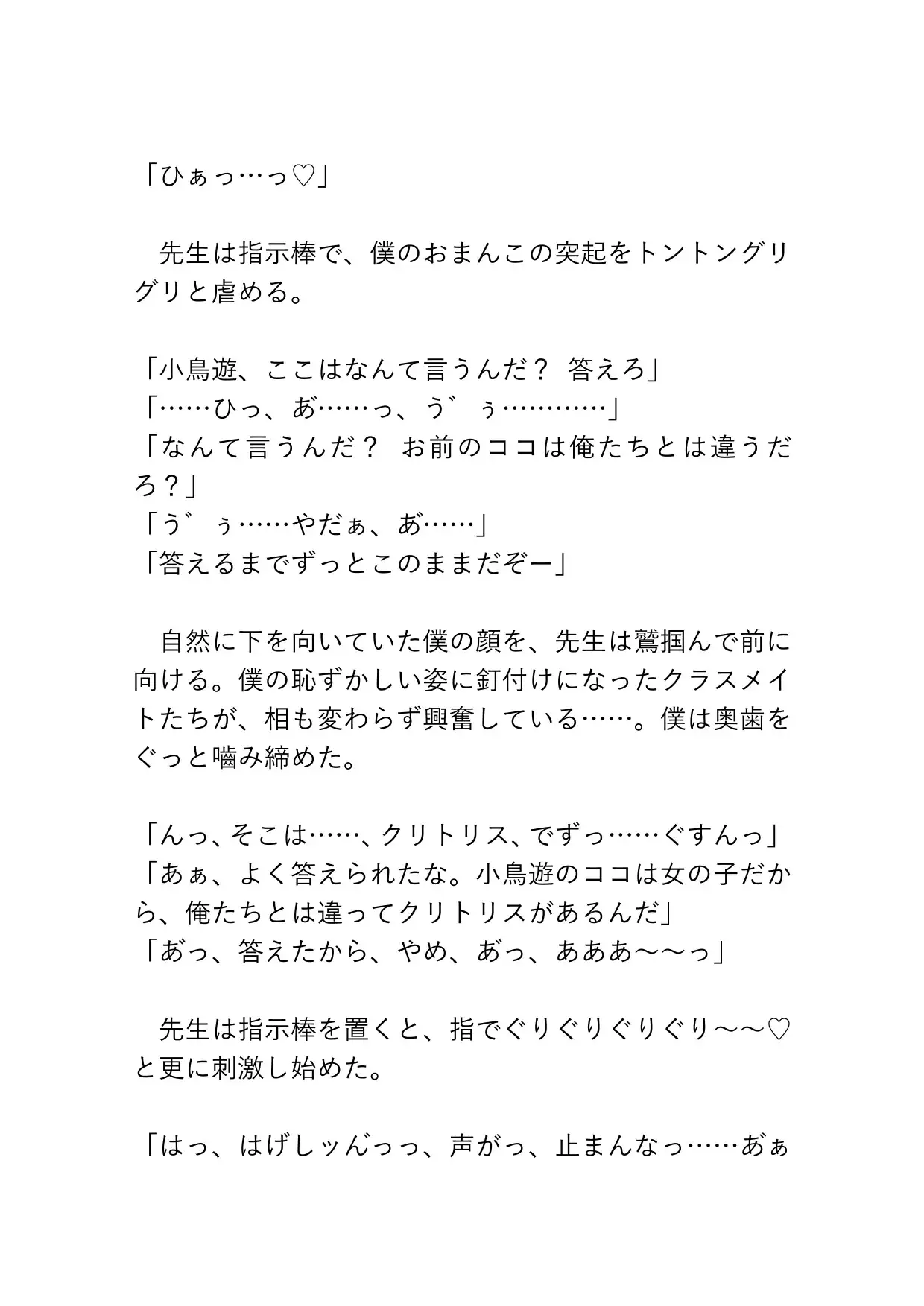 小鳥遊の生ま○こやばっ……カントボーイくんが保健の授業の実演に使われ、ずっぽり先生やクラスメイトたちに好き勝手犯されてしまうお話です♡ びゅるびゅる何度も奥まで中出しされ、容赦のないピストンたちに連続絶頂が止まらなくなってしまいます。ブシャァァァァアアとおもらしや潮吹きも♡「あ、赤ちゃん……赤ちゃんできたら、せんせ……どしよ……」