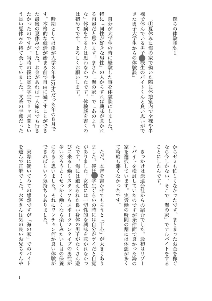 「(1)夏休みに海の家で働いた際に休憩室内で全裸や半裸で休んでいる若いバイトくんと良い思いができた男子大学生からの体験談」「(2)飲み会帰りに同僚と大人のお店に行った際に密かに好意を抱いていた同期の男子が風俗嬢にヌイてもらっているところを見れた話」
