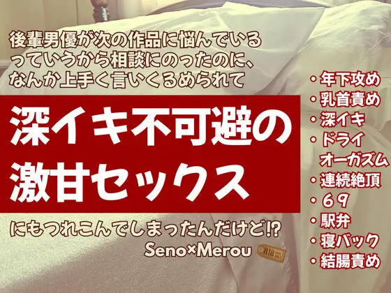 ベテランネコ男優として活躍しているメロウの元に、新人教育企画として最近入ったばかりのタチ男優と共演する仕事が入ってきた。しかしながら、メロウは元々リードが得意なタイプではない。なぜ自分にこの仕事が回ってきたのか疑問に思いながらも現場に行くと、そこには期待の新人、セノがいた。セノはデビューして3作品目、これは自分がしっかりしなければと意気込むメロウだったが、セノは新人とは思えないテクニックでメロウを追い詰めていく。アドリブも交えた演技ができすぎではないかと問うメロウに告げられたのは、なんとセノの衝撃の経歴で――!?思いっきりラブシーンを盛り込んでいますので、終始やりっぱなしに近い作品になっております。ボリュームもございますので、たっぷり濃厚なエロをお楽しみください。