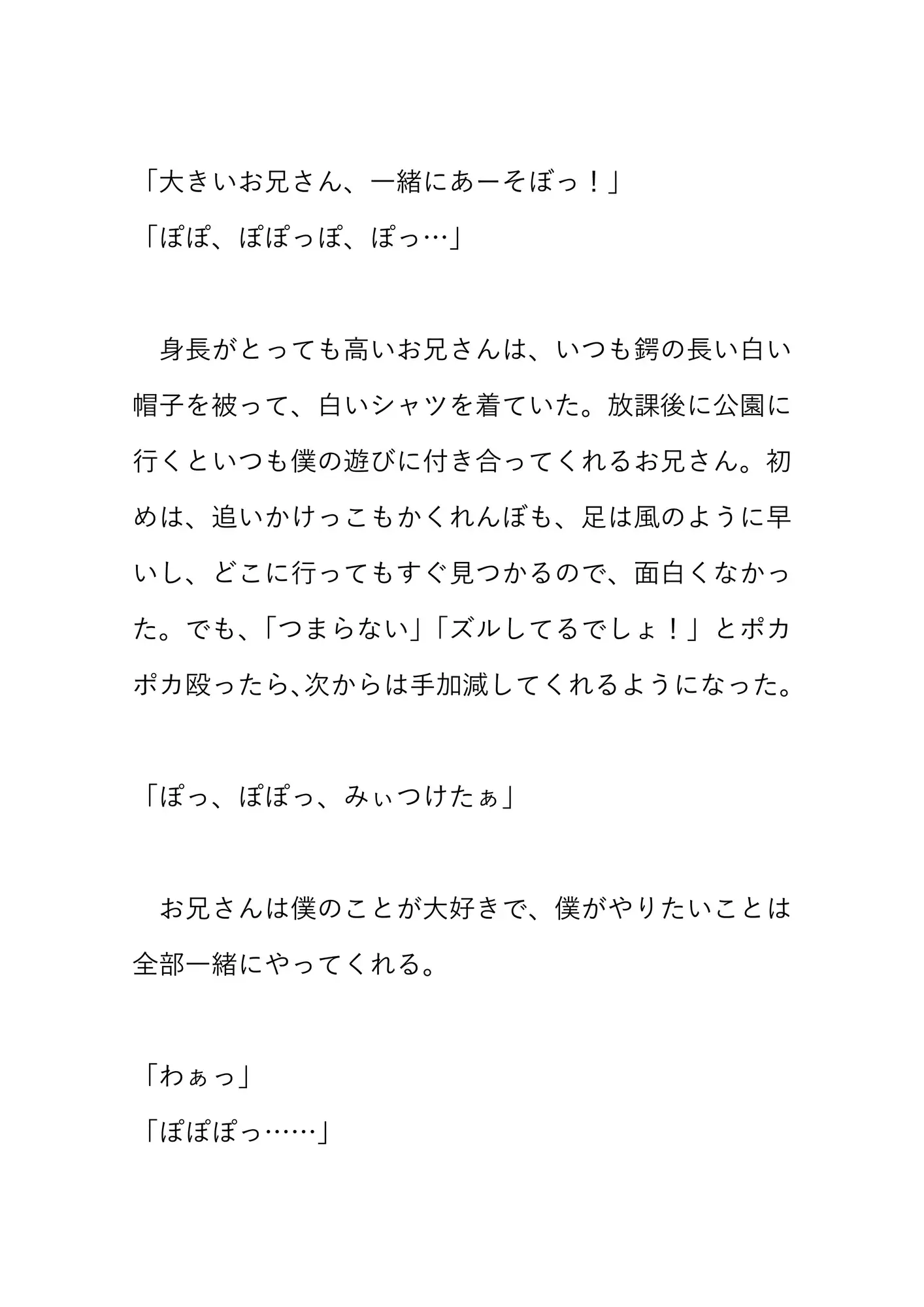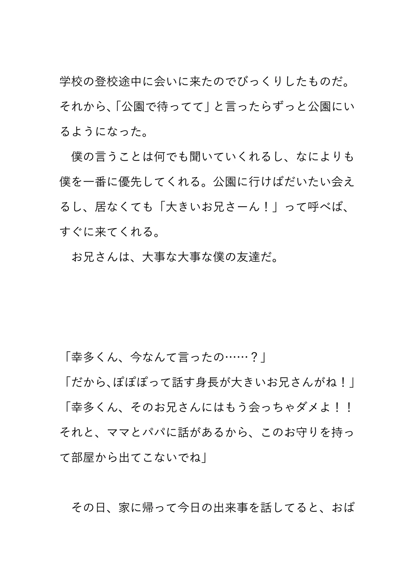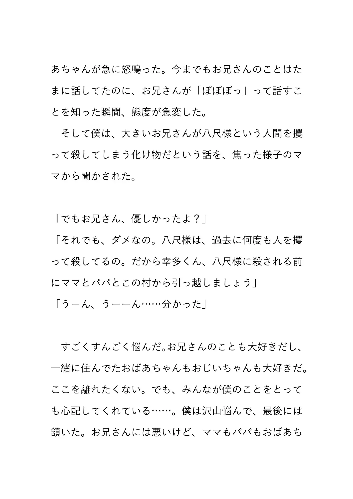 「んんんっ……お兄さん? いや゙あ゙ぁっ、お兄さん!」いつも公園で遊んでくれる大好きな大きいお兄さん。彼の正体は、村から恐れられる八尺様だった。両親は僕を連れて逃げるように村を出るが、お兄さんは僕を追ってきて……。