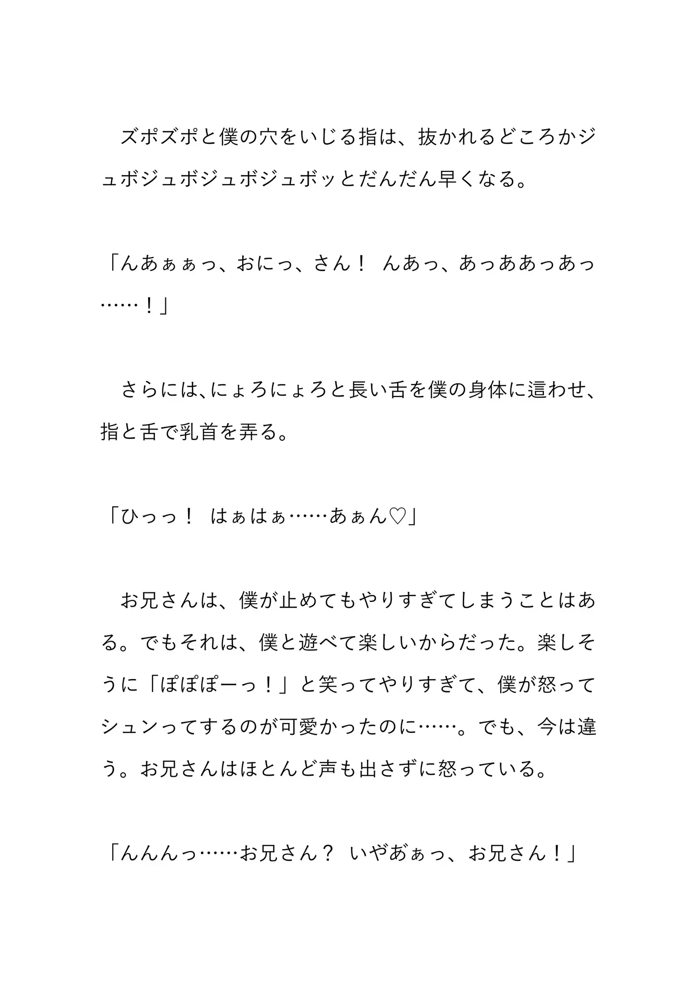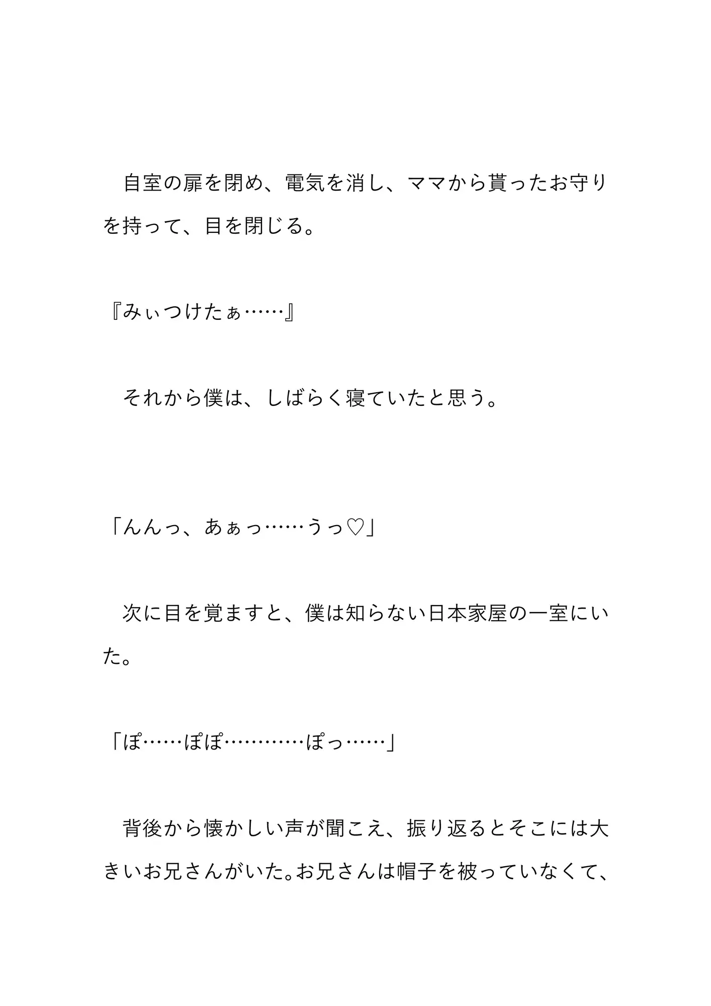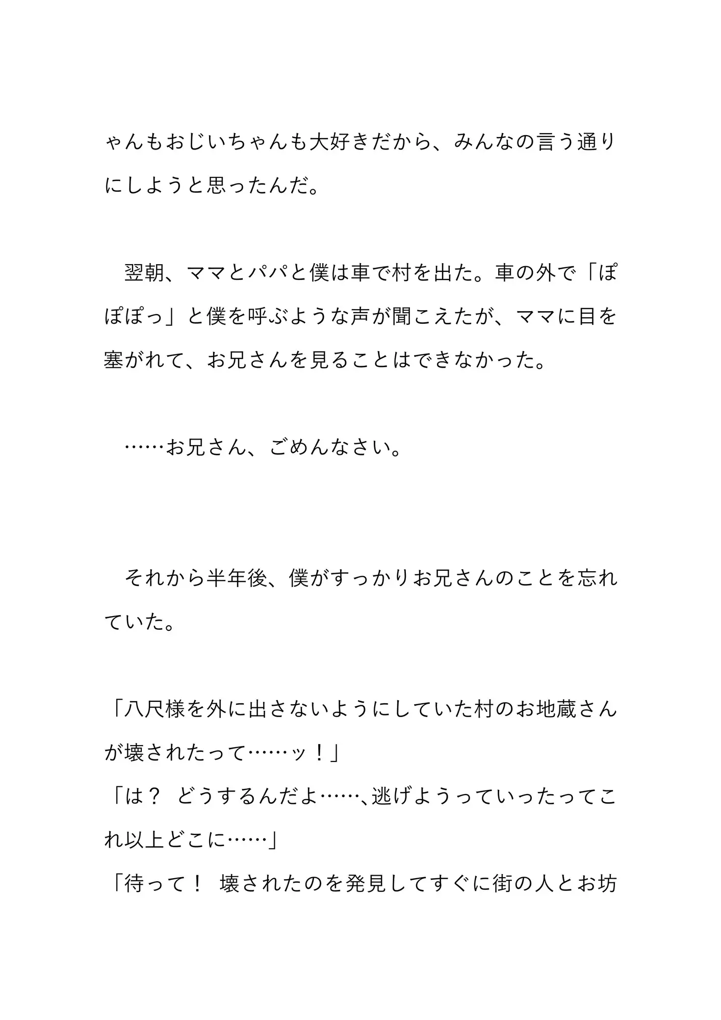 お尻の穴にお〇ん〇んを入れられ、白い白濁を注がれたかと思えば、僕のお〇ん〇んがあった場所には、ツルンとした何かができていた。お兄さんは僕のお尻の穴をずぼずぼしながら、そのビラビラとした皮膚をクパァと広げて、穴に指を入れてくる……。どうしよう……大好きなお兄さんが怖いっ。「ふえ……? 僕の身体が……も、戻して! 八尺様、もどっ、戻してください……!」