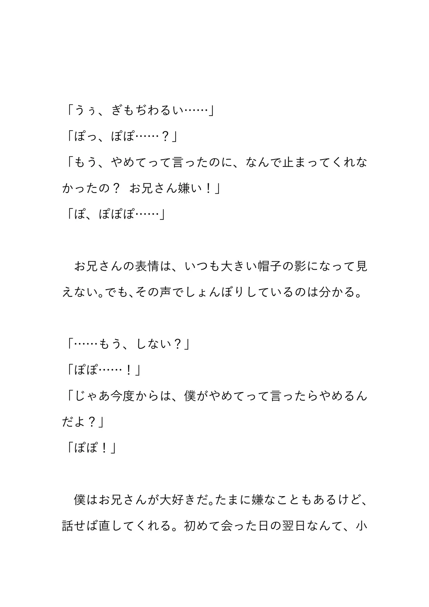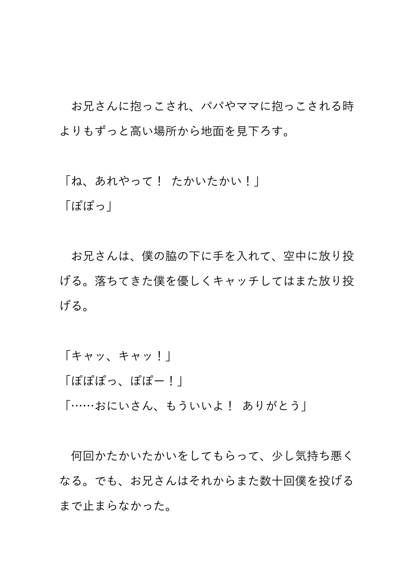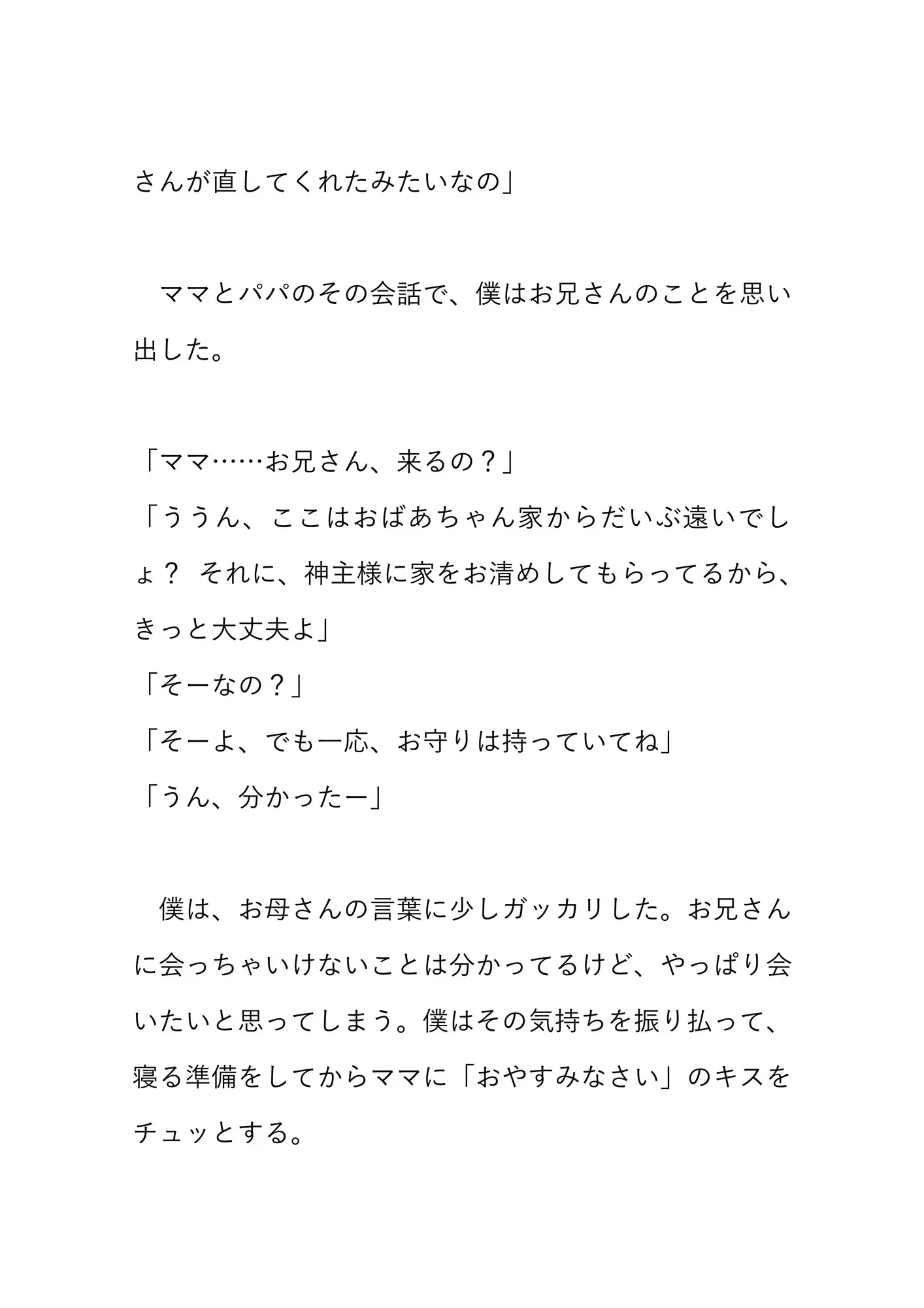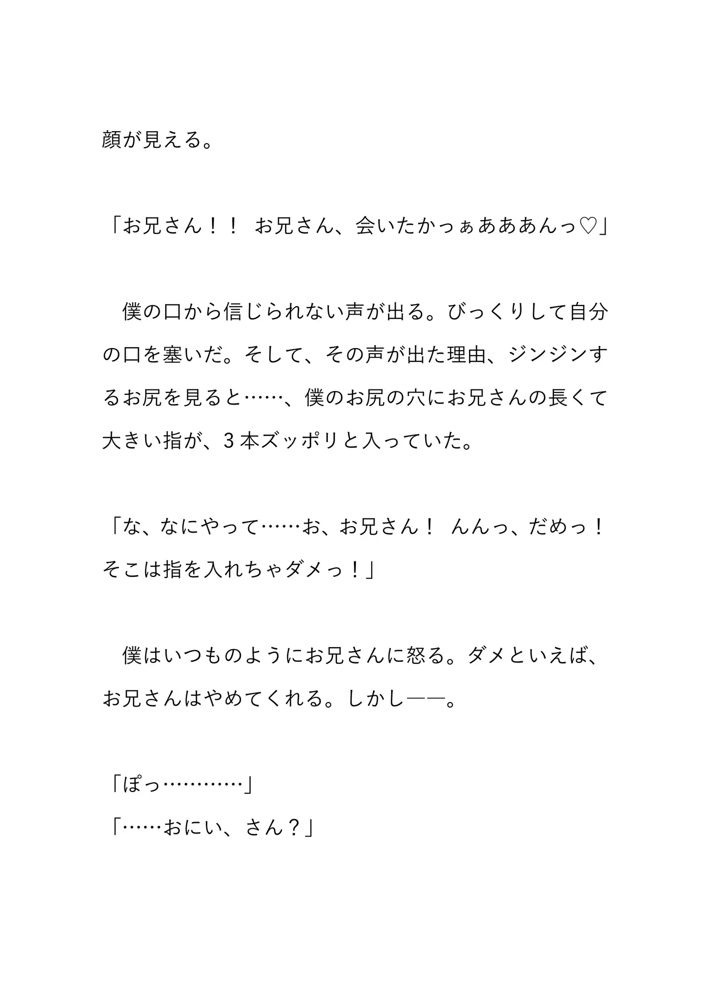 お尻の穴にお〇ん〇んを入れられ、白い白濁を注がれたかと思えば、僕のお〇ん〇んがあった場所には、ツルンとした何かができていた。お兄さんは僕のお尻の穴をずぼずぼしながら、そのビラビラとした皮膚をクパァと広げて、穴に指を入れてくる……。どうしよう……大好きなお兄さんが怖いっ。「ふえ……? 僕の身体が……も、戻して! 八尺様、もどっ、戻してください……!」