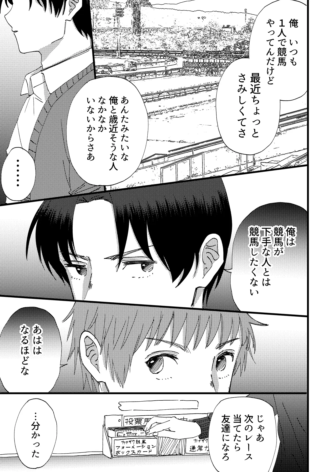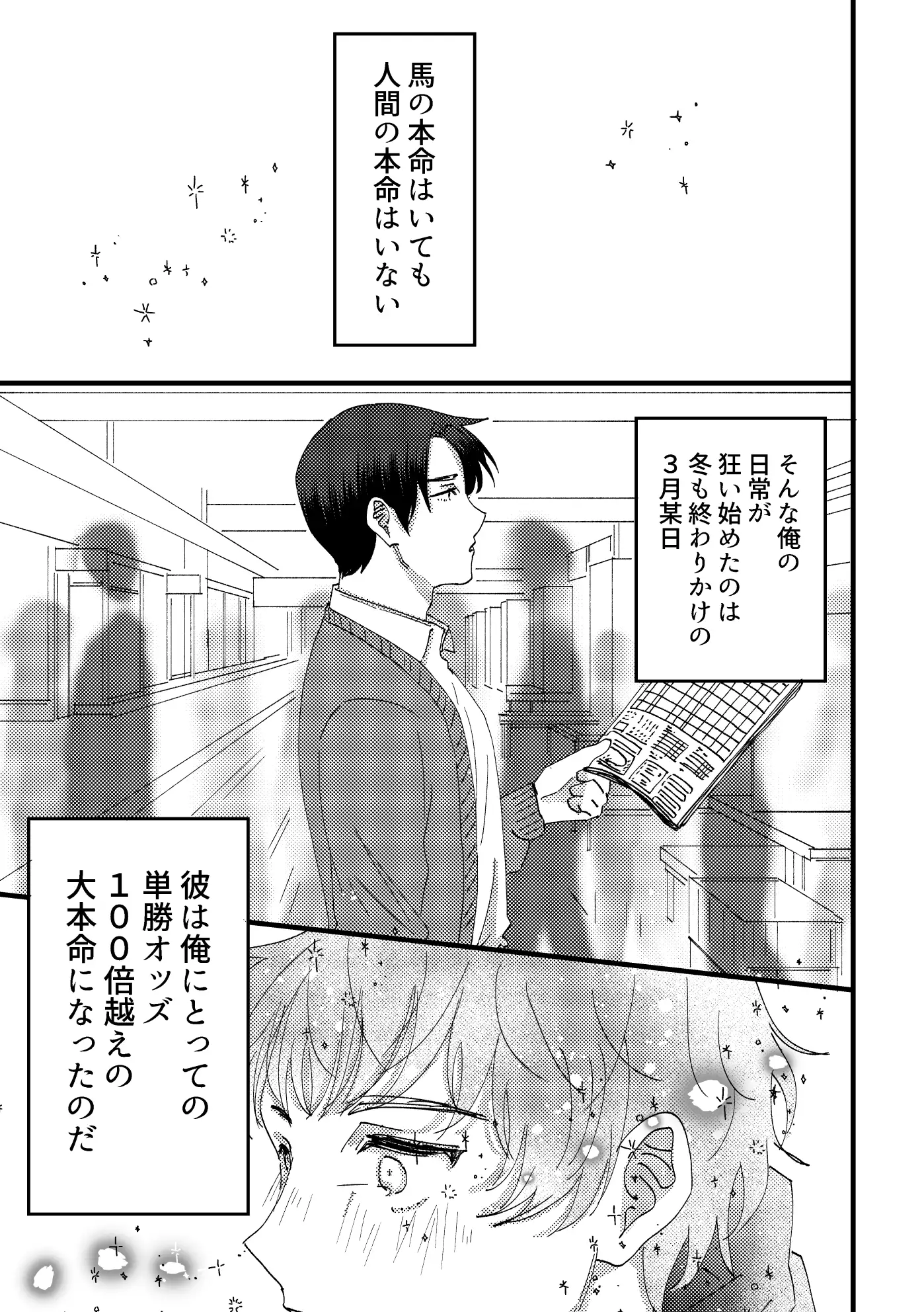 「馬の本命はいても人間の本命はいない、はずだった」競馬が好きな堂出豊は、ある日常連の競馬場で古尾謙一に一目ぼれをする。