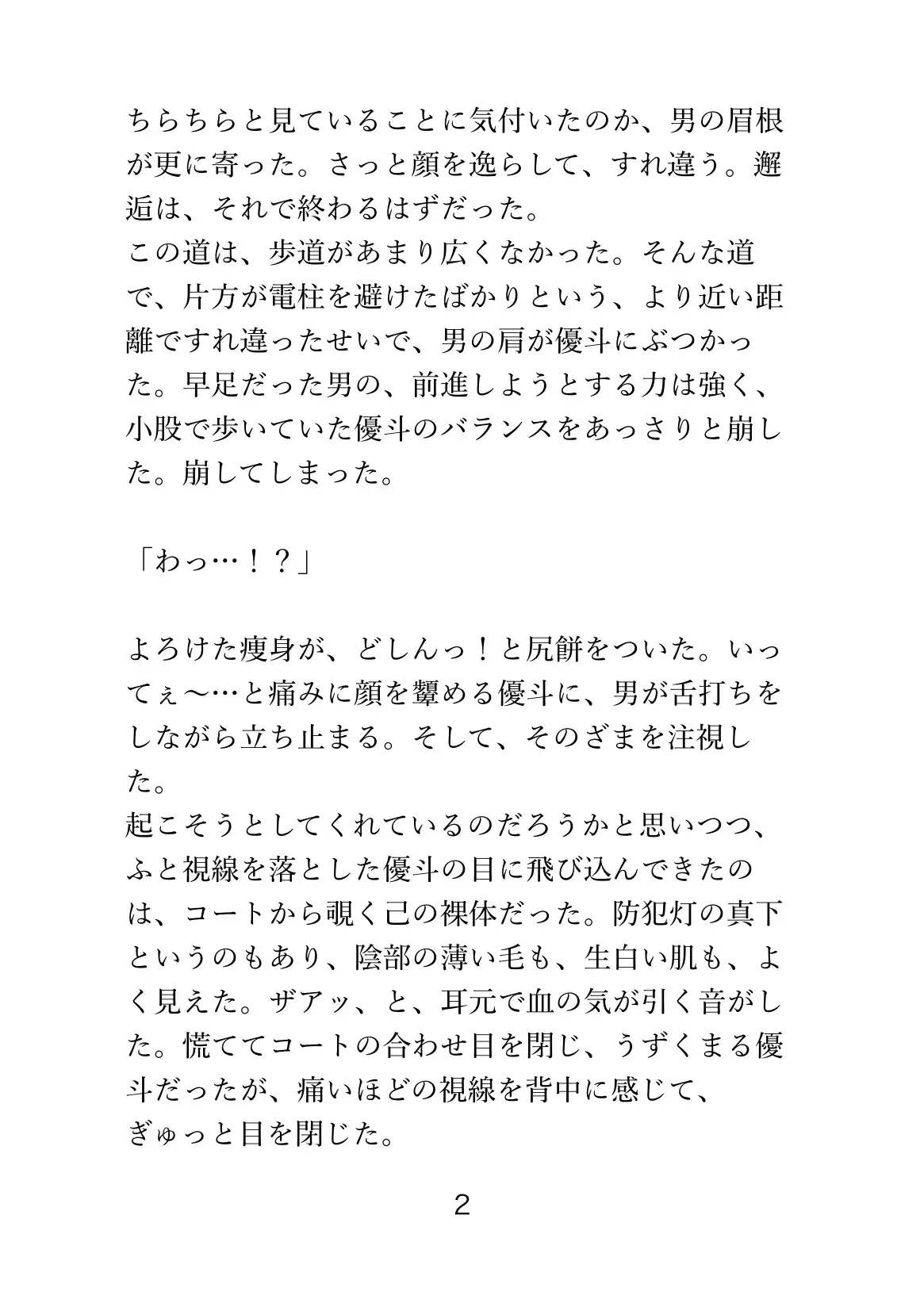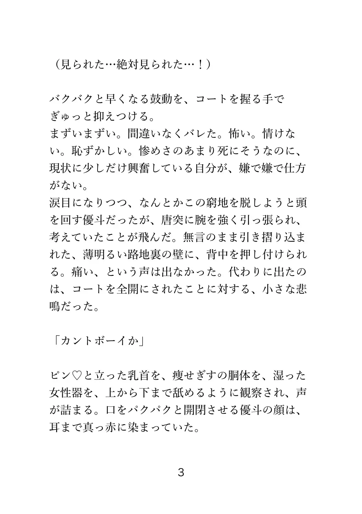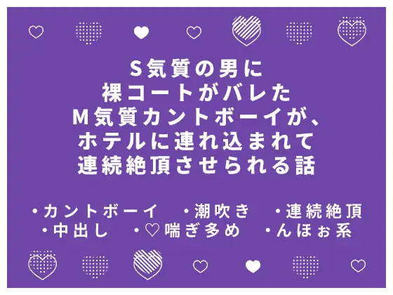 仕事帰りのサド気質男に、全裸コートで散歩していたことがバレたマゾ気質カントボーイが、路地裏で中出しされたあと、ラブホに連れ込まれてハメられまくるお話です。