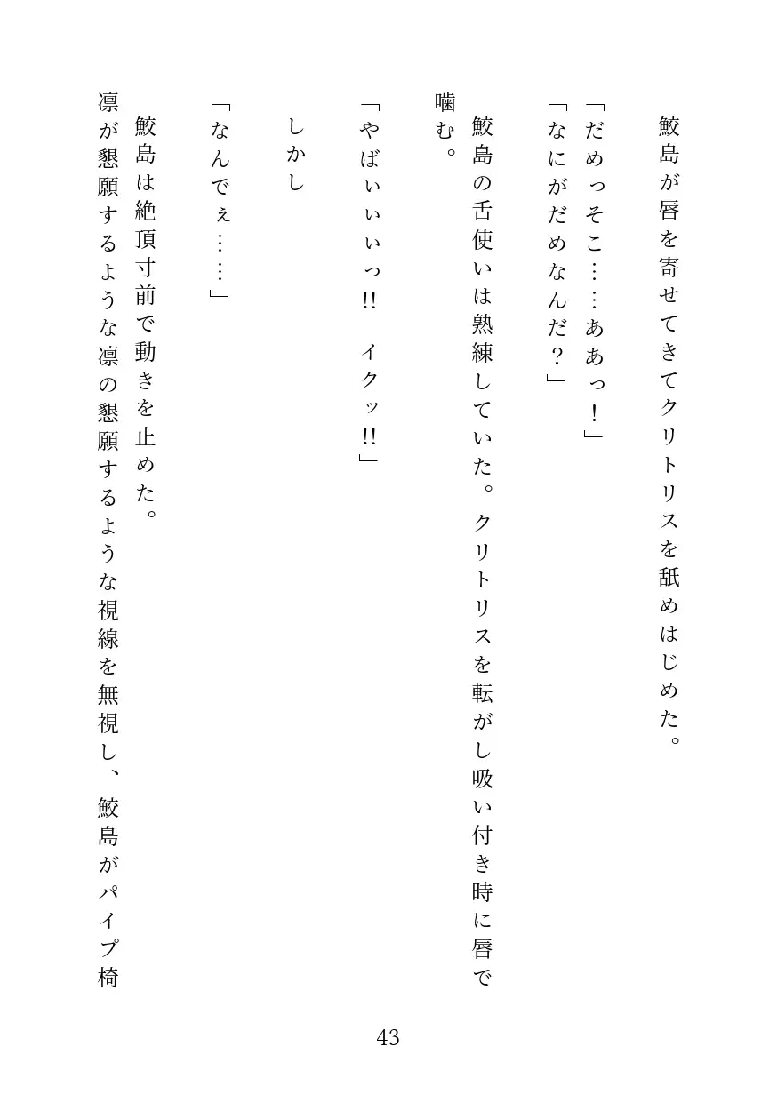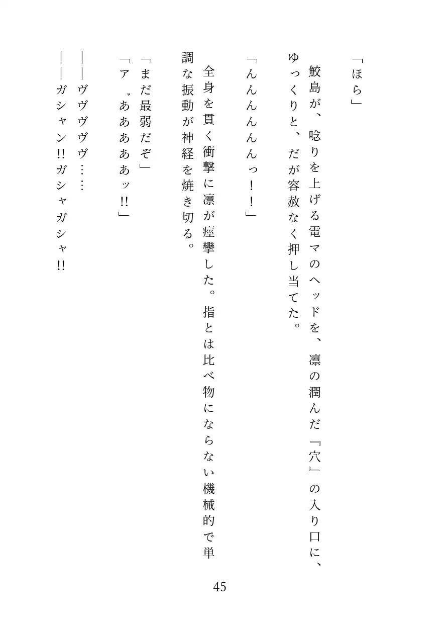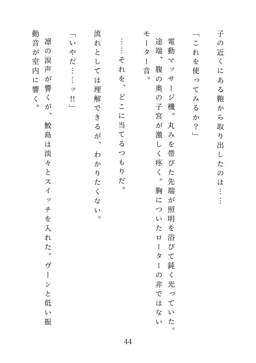 冷徹な宣告と共に叩き込まれる、高電圧の振動。一晩中溜め込んだ熱を執拗に磨り潰され、凛の自尊心は快楽の火花の中に溶けていく。■結末: