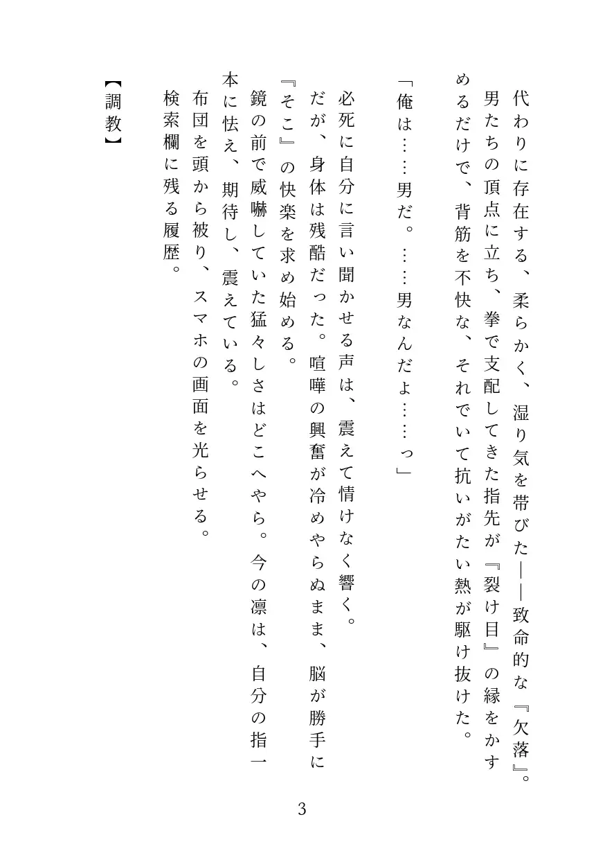 完全なメス堕ち展開: 主人公がプライドを捨て、自ら「メス」であることを認め、精神的に完堕ちする描写が含まれます。
