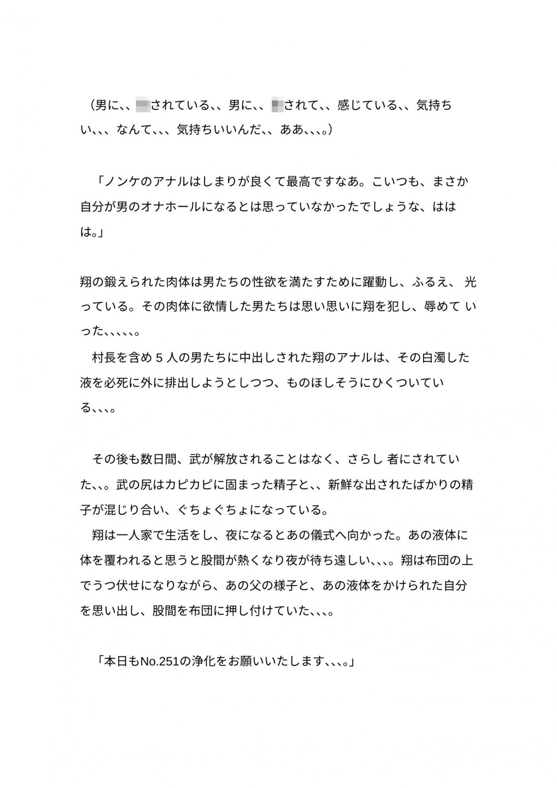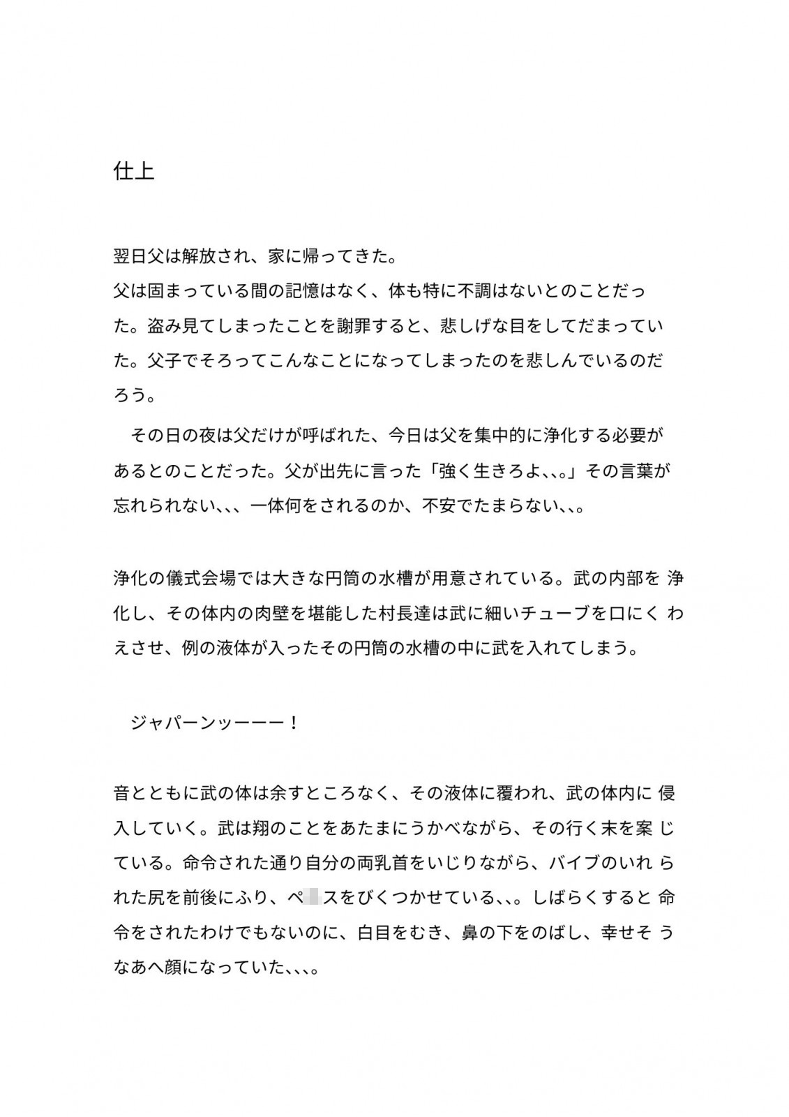 村に移住してきたボディビルダー父子が、村の儀式と称した特殊な液体を使った調教を受けおとされていきます。
