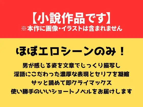 ほぼエロシーンのみ! シチュエーションだけで、めんどうなストーリーはありません。長編でも読み返すのは結局エロいところだけだな……と思ったので、読みたいと思えるものだけを凝縮しました。短いですが、そのぶん濃厚。男が感じる姿を文章でじっくり描写し、淫語にこだわった濃厚なエロ表現とセリフをこってり詰め込みました。また、さし絵を含まない文章作品なのでビジュアルは想像どおり、100%好みに合ったイメージの世界をジャマしません。ヌキたいときにサッと読めて即クライマックス! 使い勝手のいいショートノベルをお楽しみください。