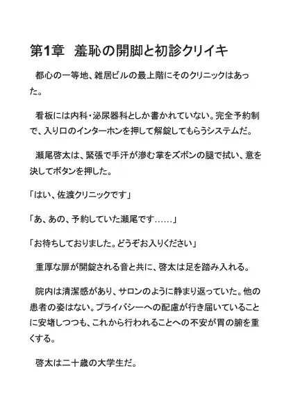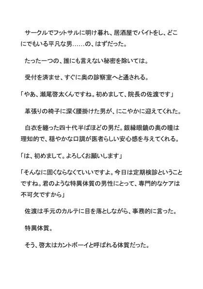 フットサルサークルでエースとして活躍する、爽やかな体育会系大学生の瀬尾啓太。 男らしい肉体を持つ彼には、誰にも言えない秘密があった。それは、股間に未発達な女性器を持つ『カントボーイ』であること。下着が擦れるほどのクリトリスの肥大に悩み、とあるクリニックを訪れた啓太を待っていたのは、理知的な風貌の院長・佐渡による「特別検診」だった。 遮蔽カーテンのない診察台でM字開脚を強○され、羞恥に染まる啓太。