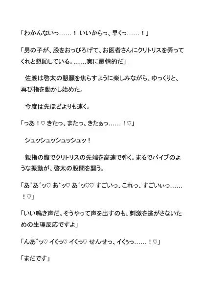 ■容赦ないクリトリス開発と連続絶頂 「治療」という名目で行われるのは、徹底的な性感帯のチェック。 綿棒での粘膜刺激、温感ローションと氷を使った温度責め、さらには開口器で包皮を強○的に剥き出しにされ、敏感な亀頭を直接弄り回される。 男としての尊厳は崩壊し、啓太の口からは「メス穴」としての懇願が漏れ始める。