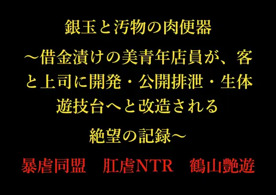 筆力あふれる描写で描く、魂まで破壊される究極の凌○・改造ノベル。【あらすじ】 北関東のパチンコ店で働く小野寺蒼士は、店長の野村から日常的なパワハラを受けていた。ある日、裏社会の人間である琳極澤士郎の遊技台でトラブルを起こしてしまった蒼士は、法外な賠償金を請求される。 「払えないなら、身体で払うしかないな?」 密室の店長室、裏の交換所、そして会員制の地下サロン……。 場所を変えるごとにエスカレートしていく陵○。 浣腸による強○排泄、パチンコ玉の挿入、ウナギ責め、そして焼印とピアスによる「人体改造」。 美しかった青年が、ただの「穴」へと作り変えられていく過程を克明に描く。