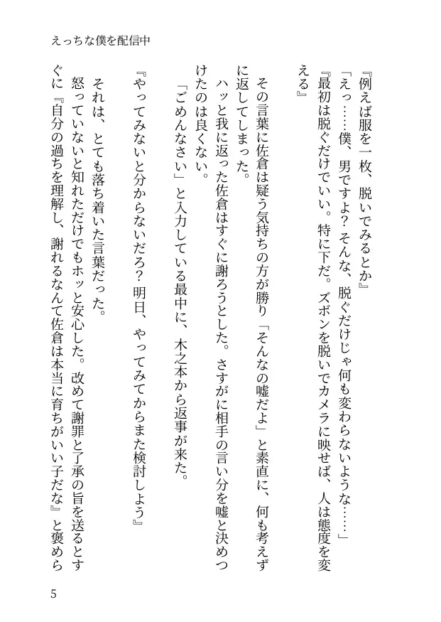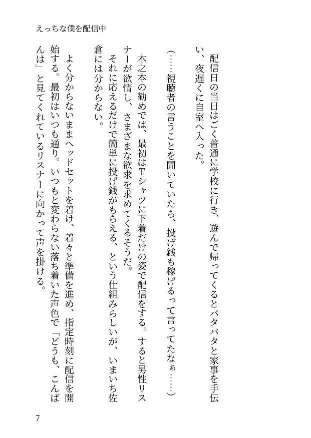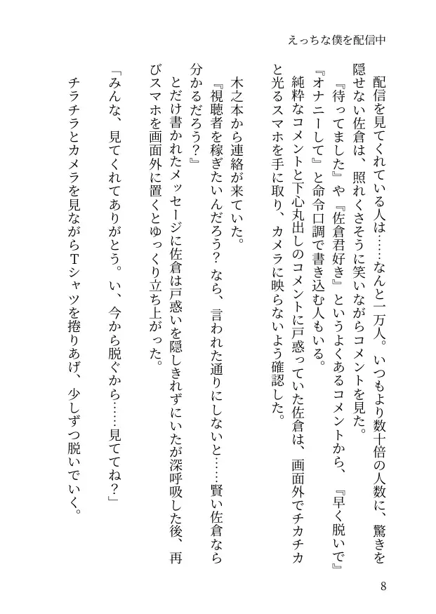薬漬けにされ、男〇器を小さくされ、乳首にピアスを貫通され───快楽に堕ちる様を生配信されながら佐倉は溺れていく。小説 71p(本文67p+あとがき1p+表紙等3p)