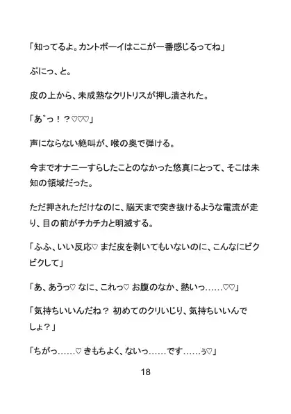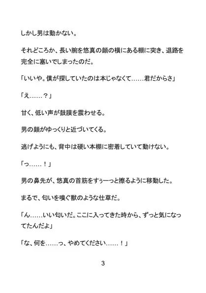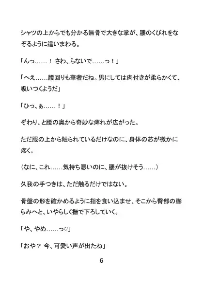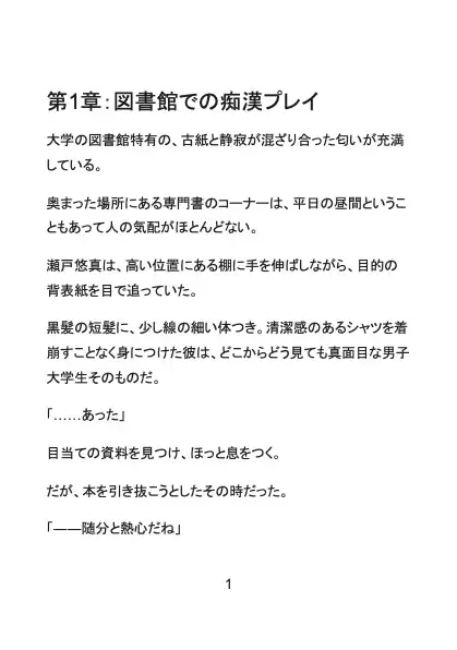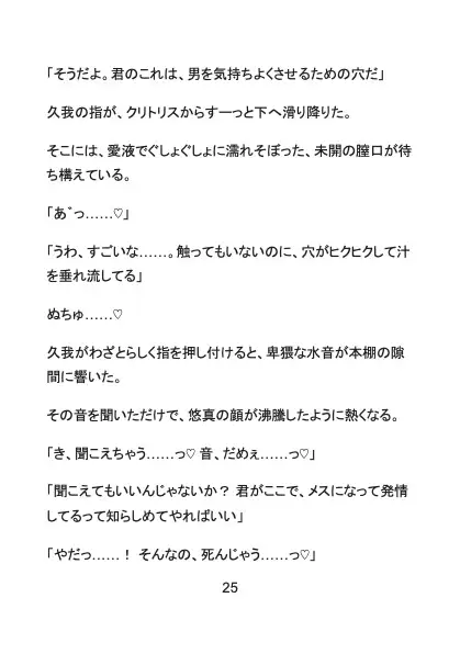 ある日、大学の図書館で本を探していた悠真は、背後に立った長身のイケメン・久我にその秘密を嗅ぎつけられてしまう。 静まり返った本棚の影、逃げ場のない状況で始まる執拗な愛撫。 服の上から乳首を弄られ、誰にも触らせたことのない未開発のクリトリスを剥き出しにされ、強○的に快感を教え込まれていく。
