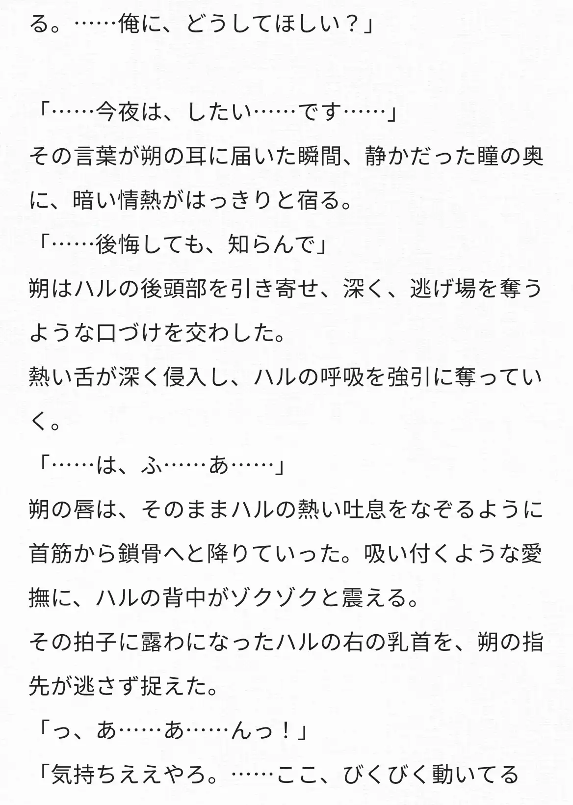 余裕たっぷりにハルを翻弄し、快楽の底へと突き落とす朔の言葉責め。甘い毒。