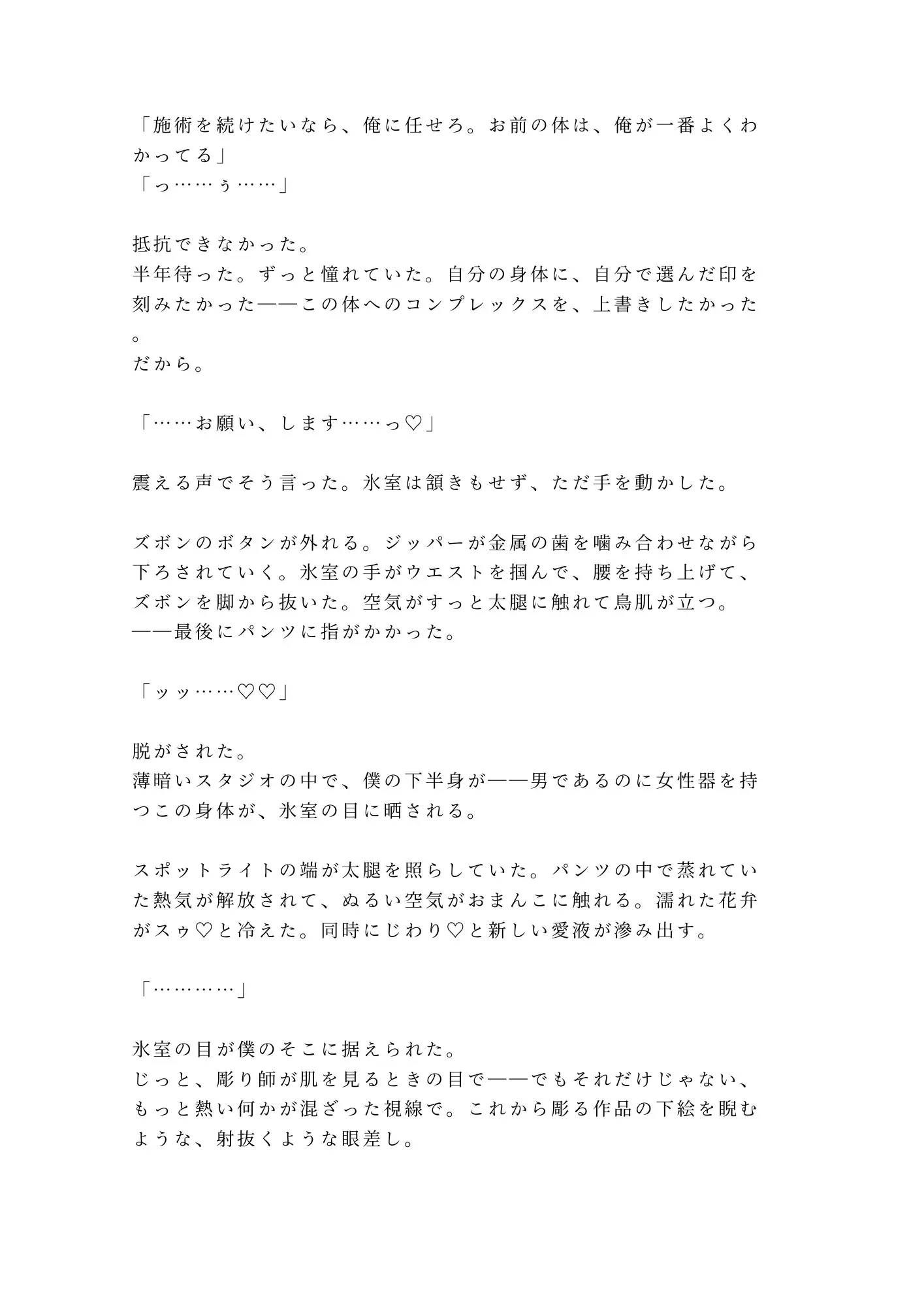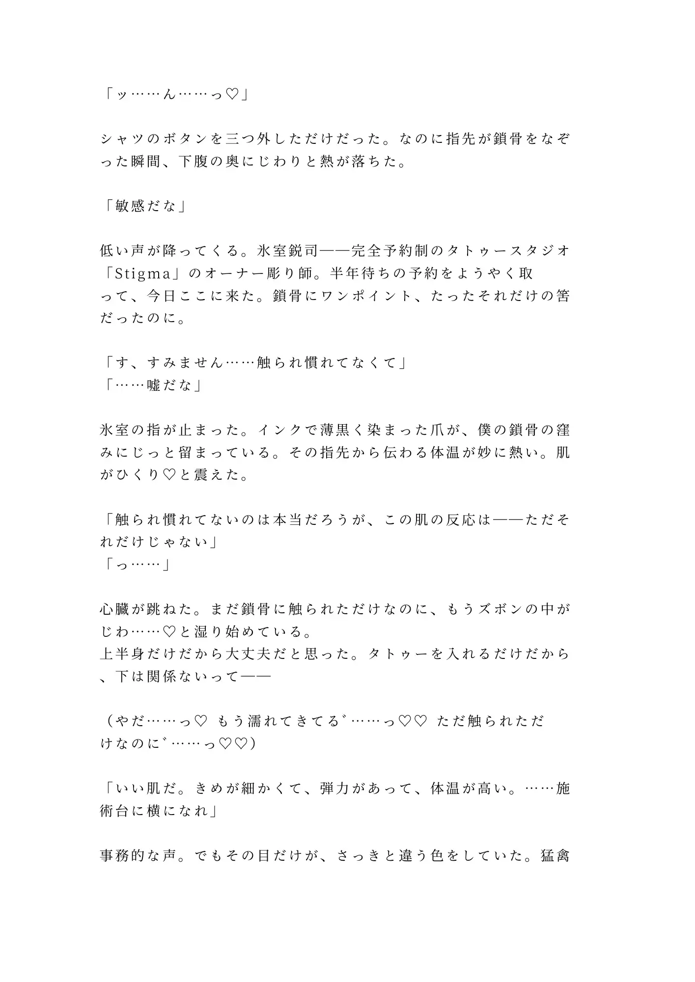 自分の身体に、自分で選んだ印を刻みたい——ただそれだけの願いだった。カントボーイとして生まれた主人公は、誰にも肌を触れさせず、秘密を抱えたまま二十一年を生きてきた。コンプレックスを上書きするために半年待ちの予約を取り、完全予約制タトゥースタジオ「Stigma」の扉を叩く。待っていたのは、オーナー彫り師・氷室鋭司。何千人もの肌に触れてきた指は、鎖骨に最初の一針を入れる前に、すべてを見抜いてしまう。