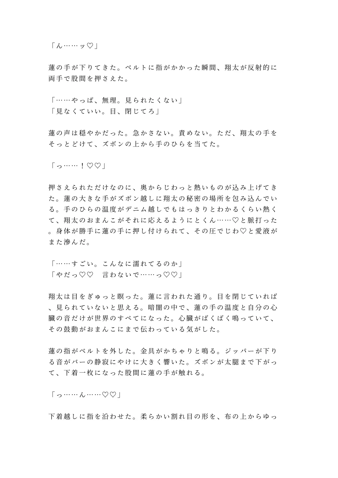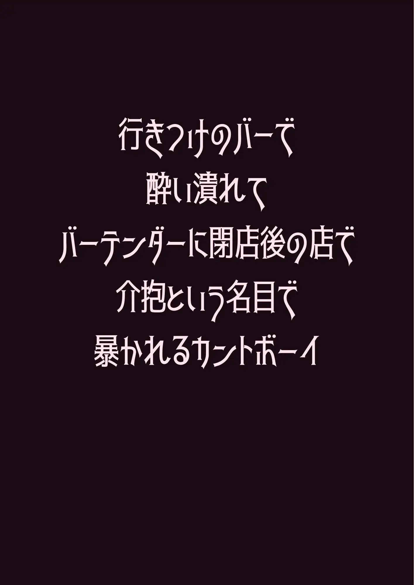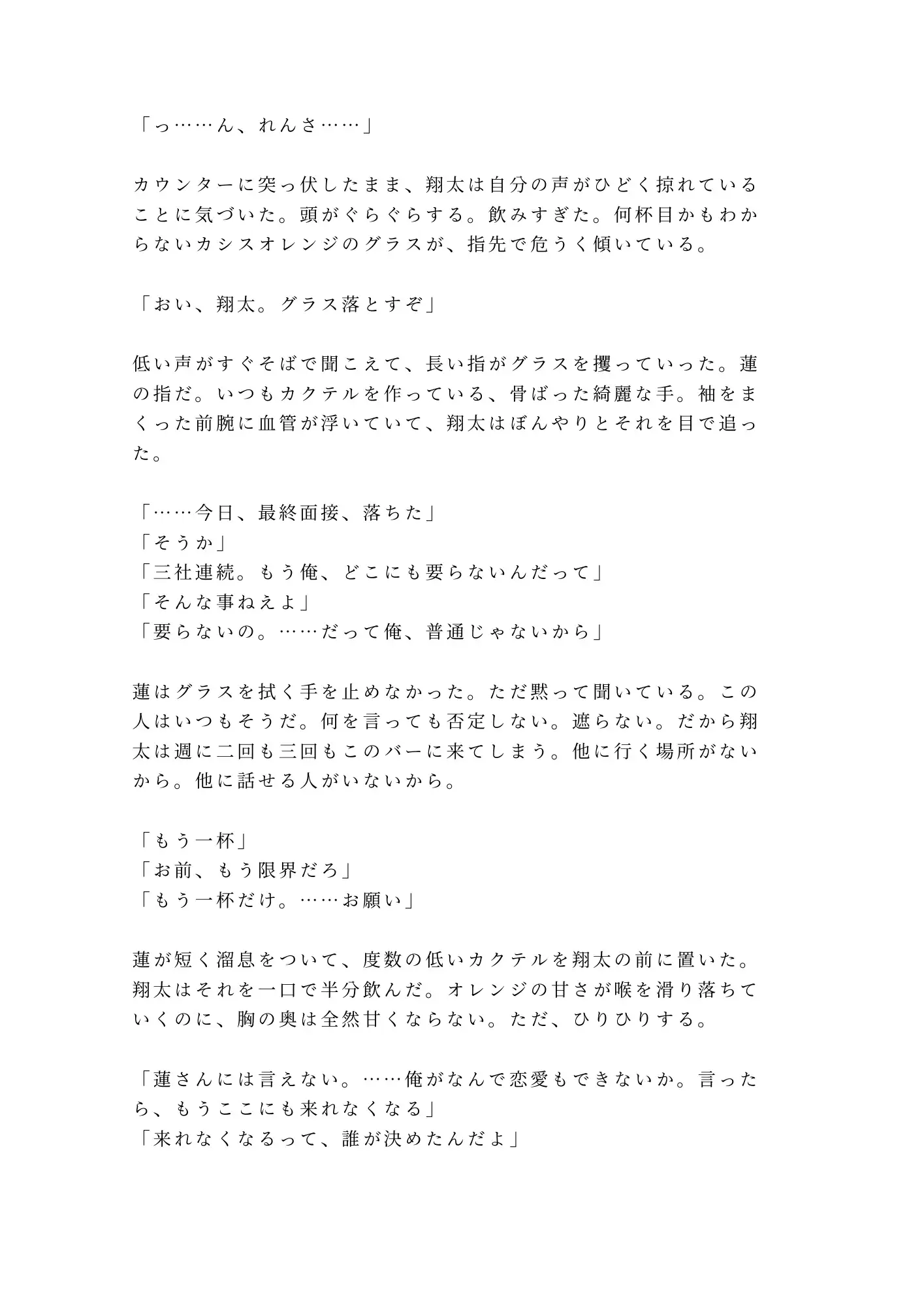 ある金曜の夜、最終面接に落ちた絶望から限界まで飲み潰れた翔太は、閉店後の店に残される。介抱する蓮の手が偶然、翔太の秘密に触れてしまい——。