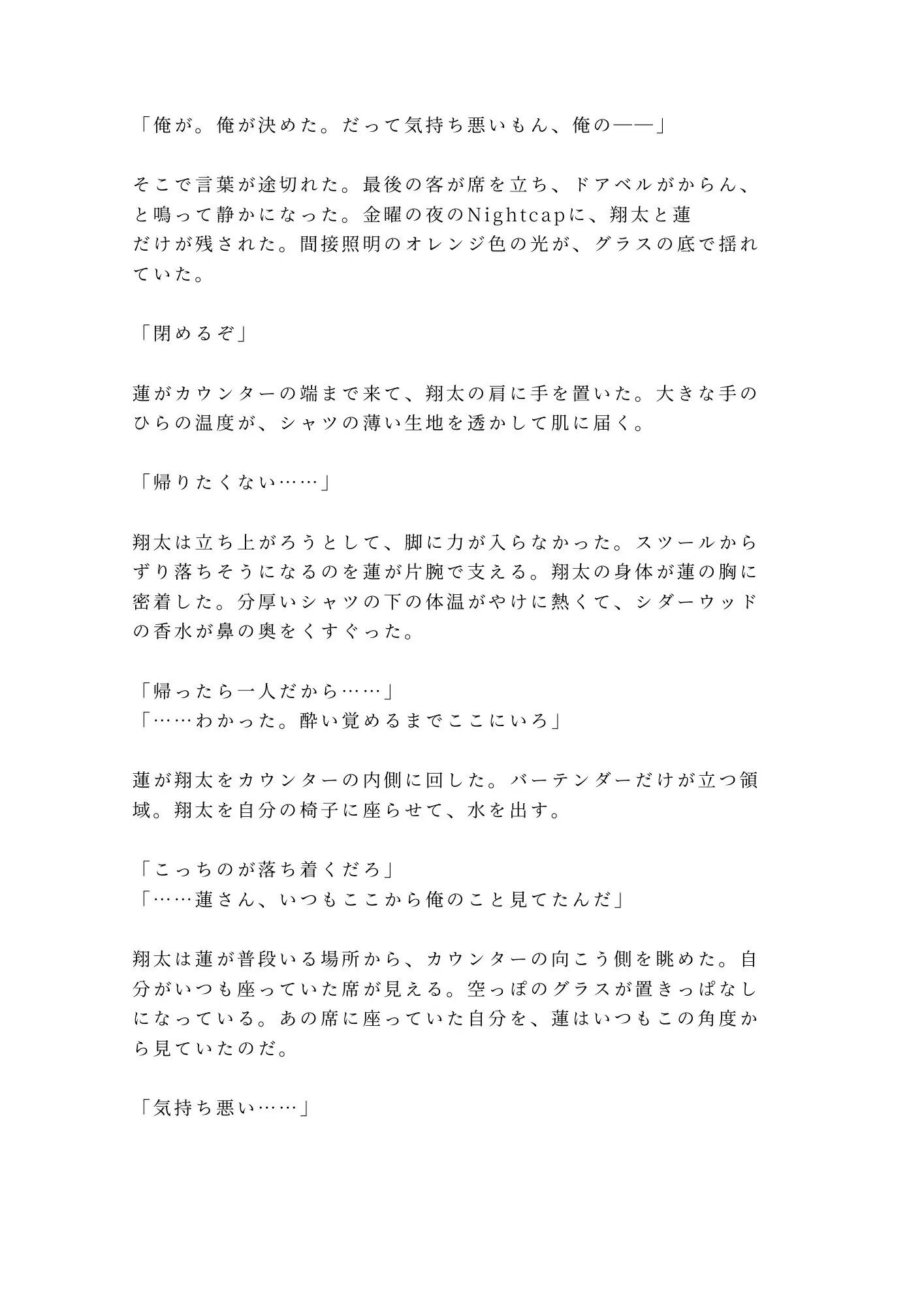 仕事場で気になっていたあの人に、誰にも言えない秘密を知られてしまったら——。就活に失敗し続け、自分の存在価値を見失いかけている大学生・翔太。唯一の居場所は、行きつけのバー「Nightcap」のカウンター席だった。寡黙で優しいバーテンダー・蓮は、翔太がどんなに酔っても、どんなに弱音を吐いても、ただ黙って隣にいてくれる。いつしか翔太にとって蓮は、恋心を自覚しながらも決して踏み込めない存在になっていた。