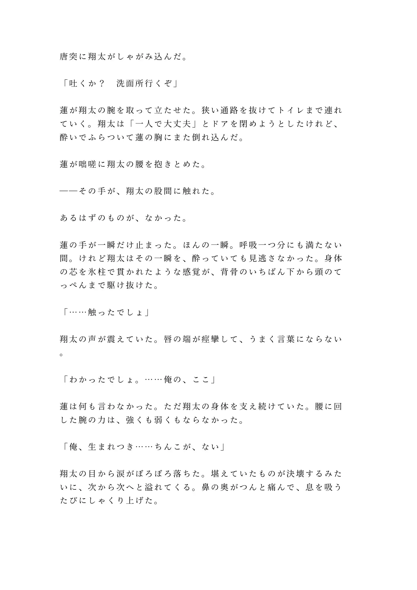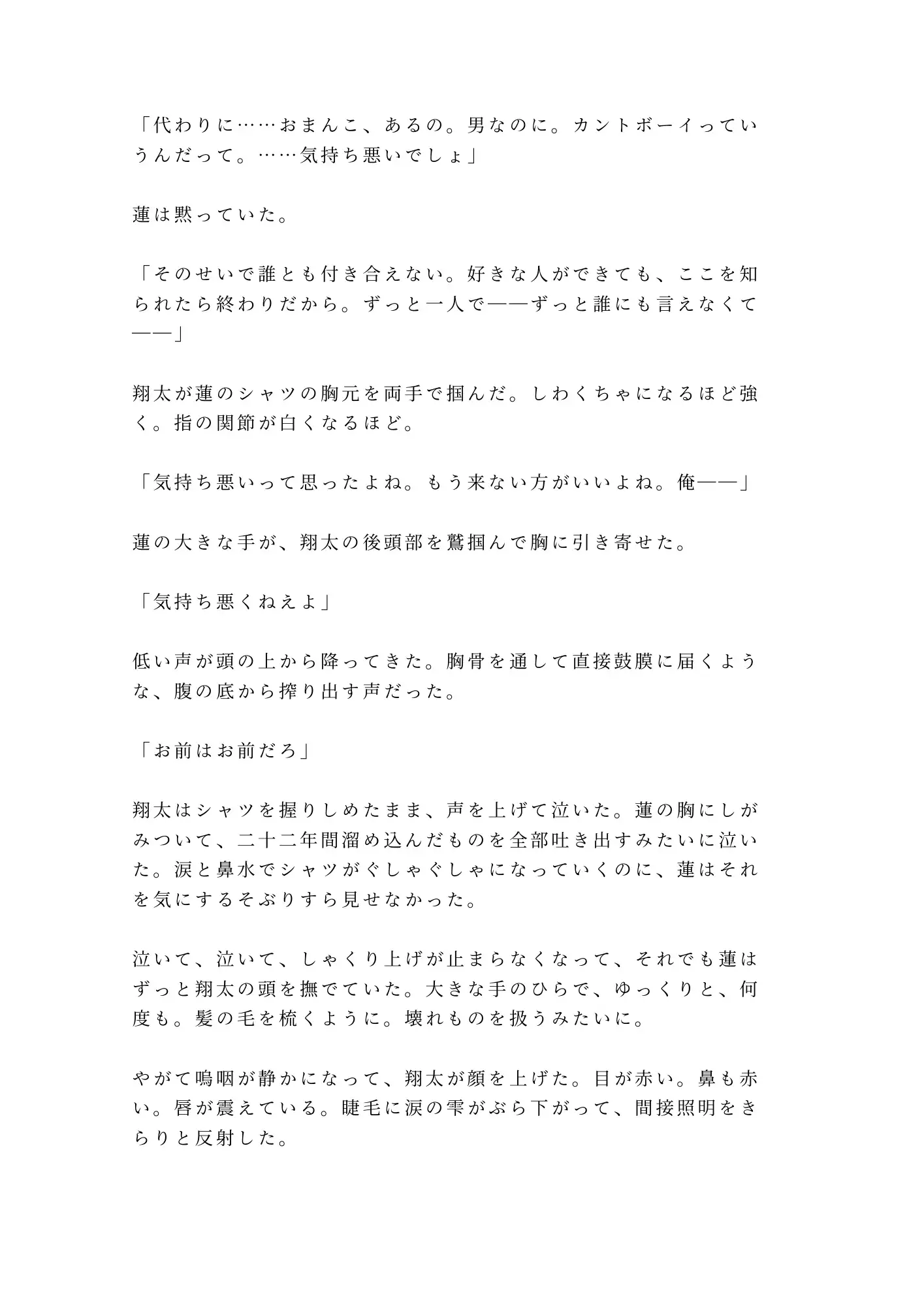 翔太には誰にも明かせない秘密がある。生まれつき男性器がなく、代わりに女性器を持つ身体——カントボーイであること。そのせいで恋愛を諦め、人との距離を測り続けてきた二十二年間。