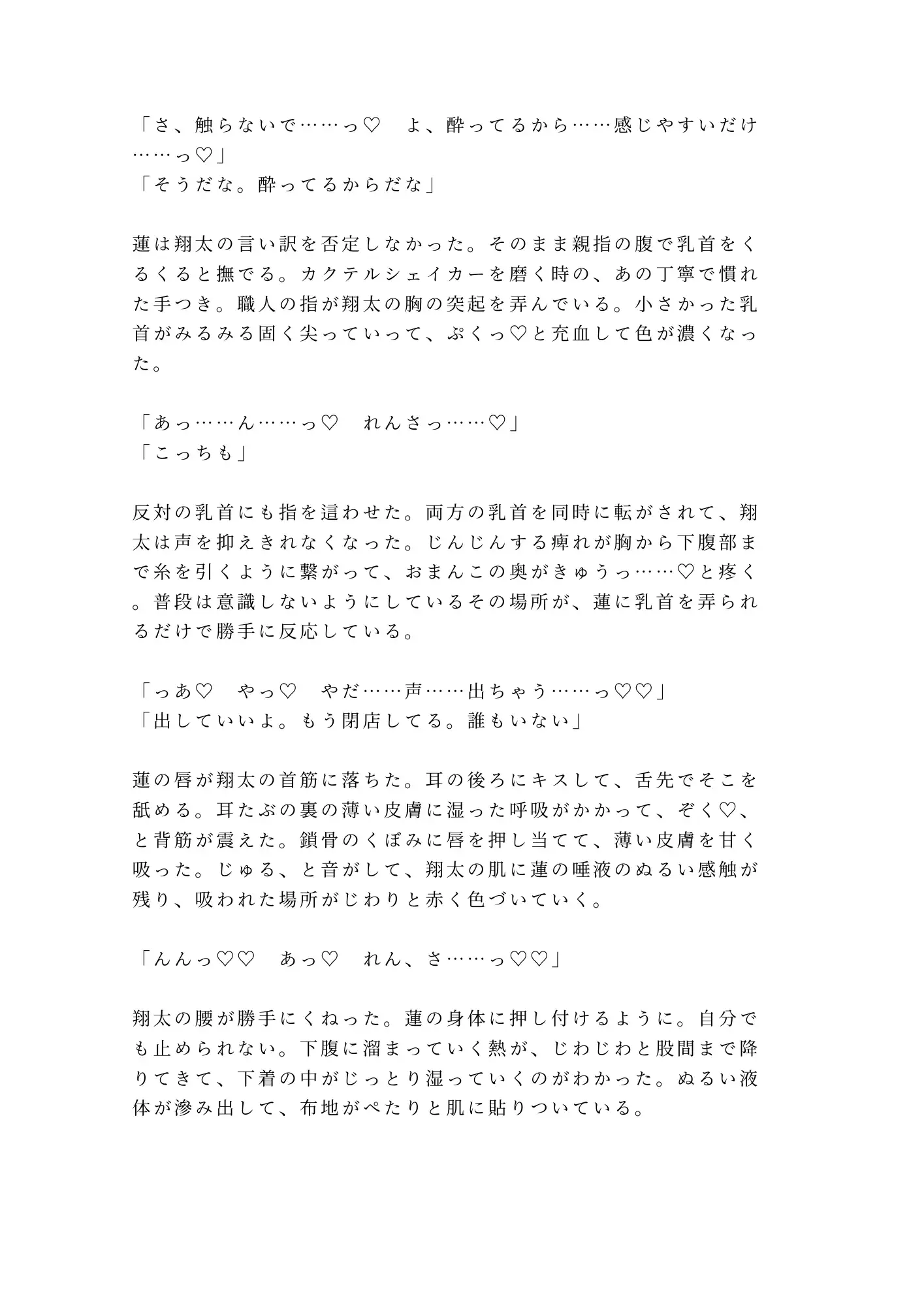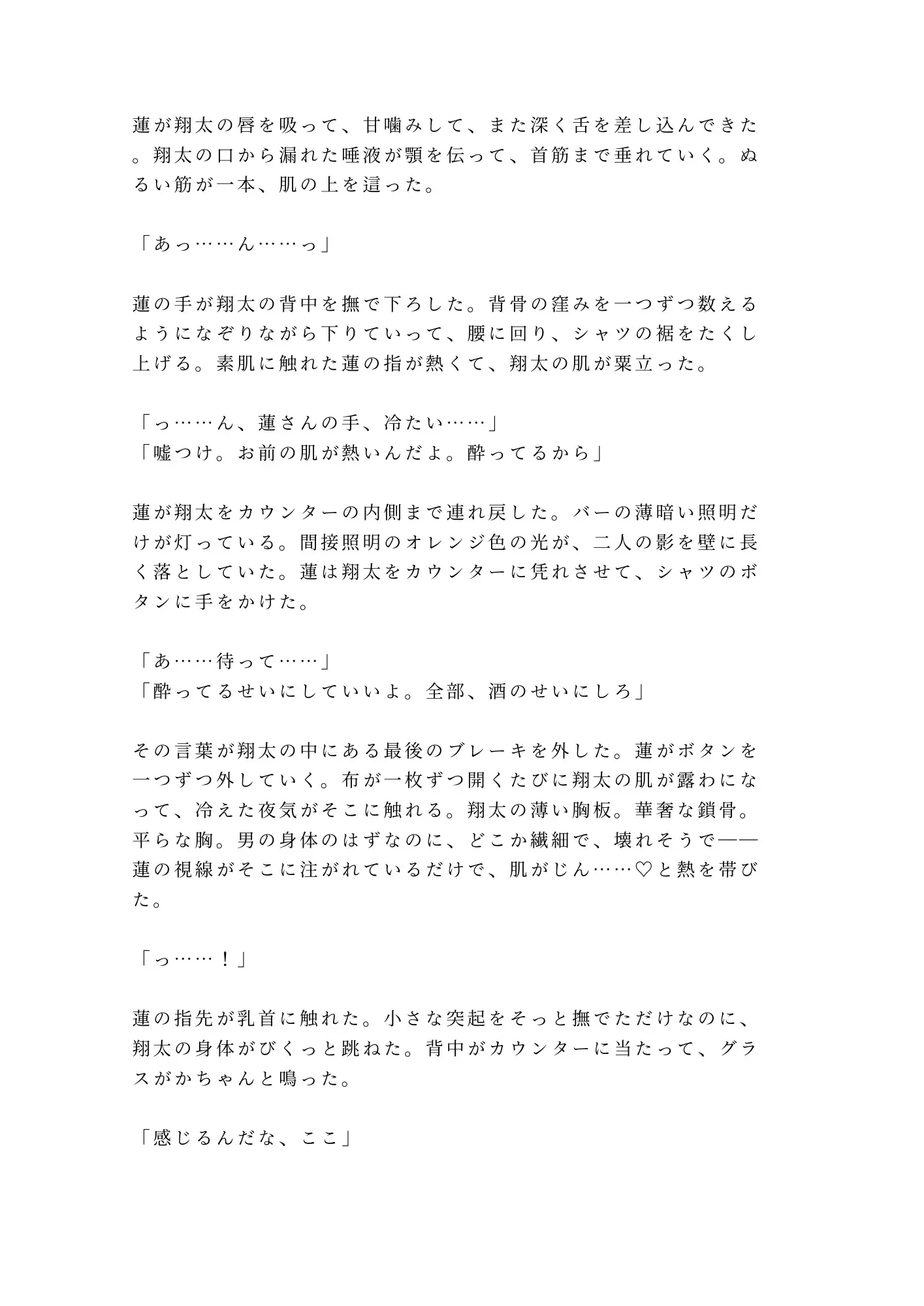 涙も秘密も全部受け止めた蓮が、次に翔太に触れるとき、その手はもうグラスを磨く手つきではなかった。カクテルを作るように丁寧に、けれど確かな熱を持って、翔太がずっと隠してきた身体を暴いていく。