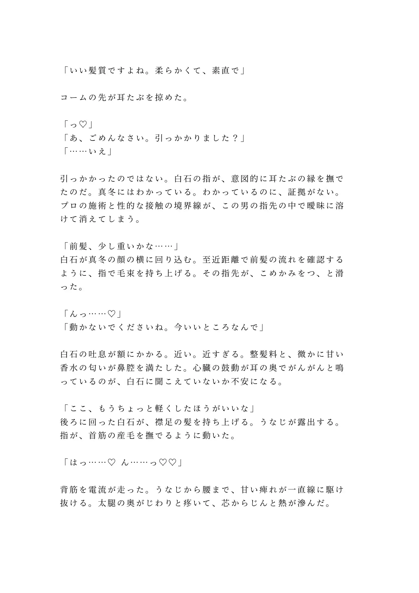 だが、撮影前日のヘアメイクリハーサルで出会ったカリスマ美容師・白石遥は、たった一度の施術で真冬の体の異変を見抜いてしまう。首筋に触れたときの肌の粟立ち、耳の後ろを撫でたときの体温の変化、シャンプー中の心拍の乱れ——何千人もの髪と肌に触れてきたプロの指先は、真冬の秘密を正確に読み取っていた。