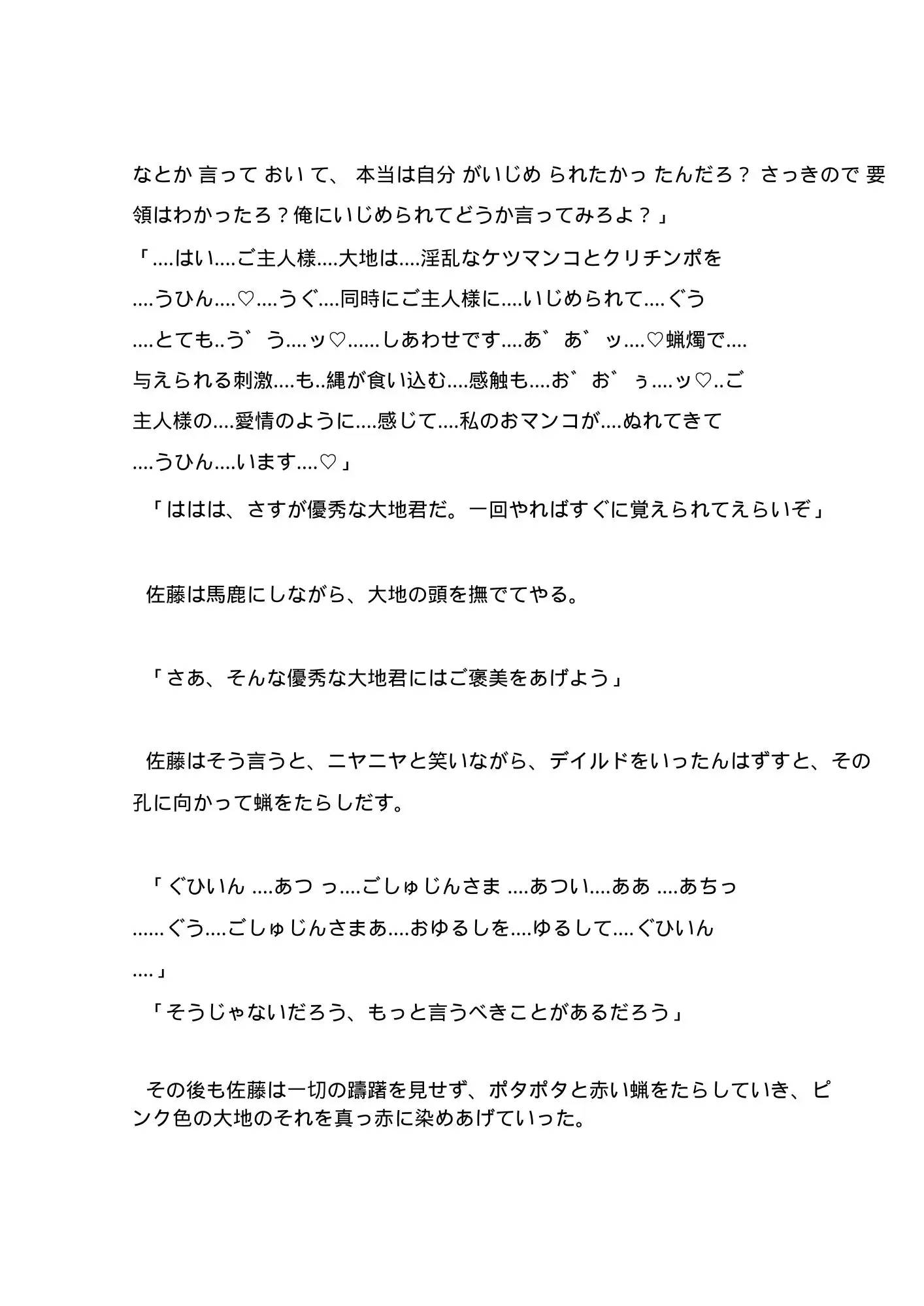 レ○プ、裸踊り、蝋燭、イボ付きディルド、青〇、吊り、羞恥露出、言葉責め、背徳系。