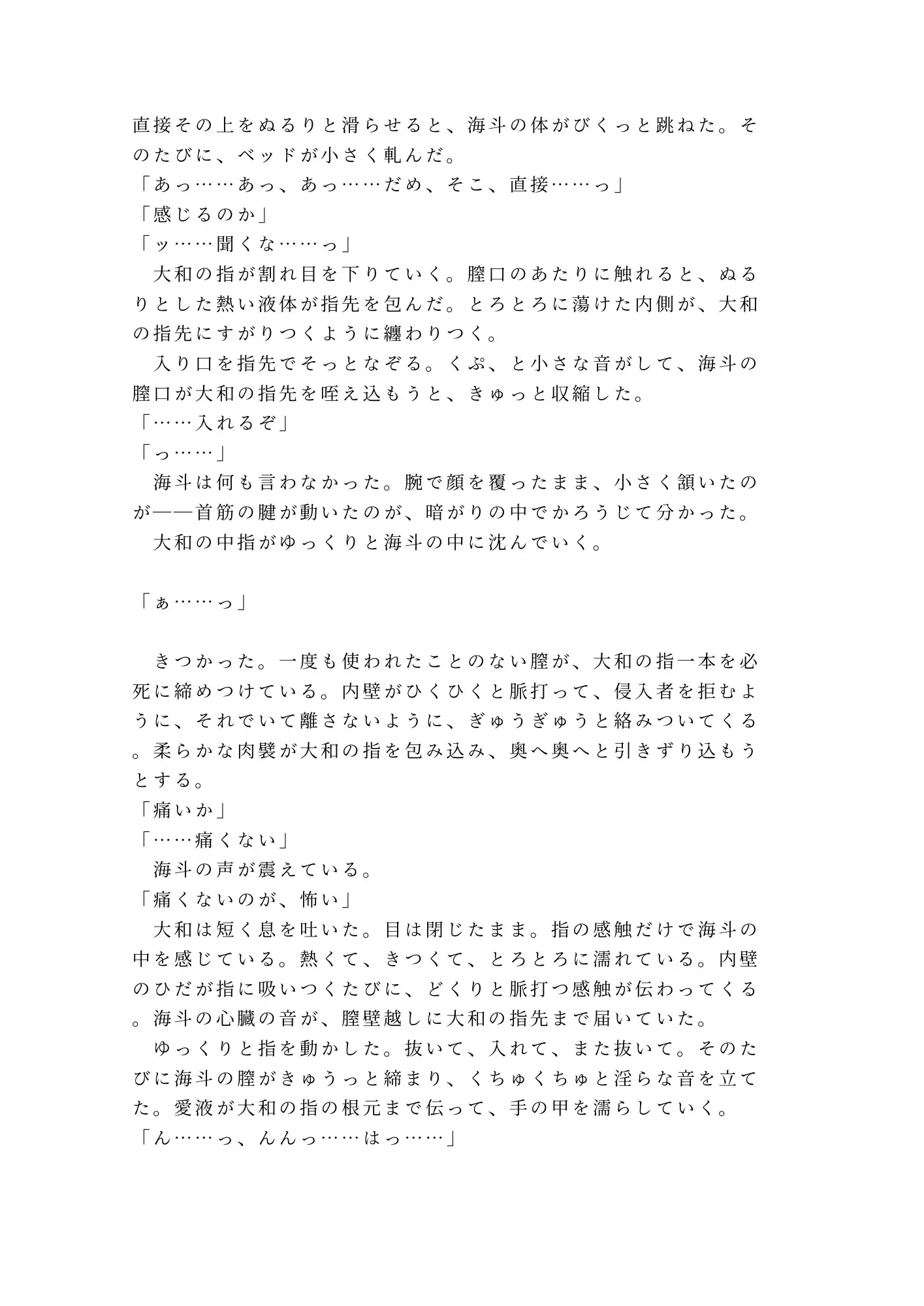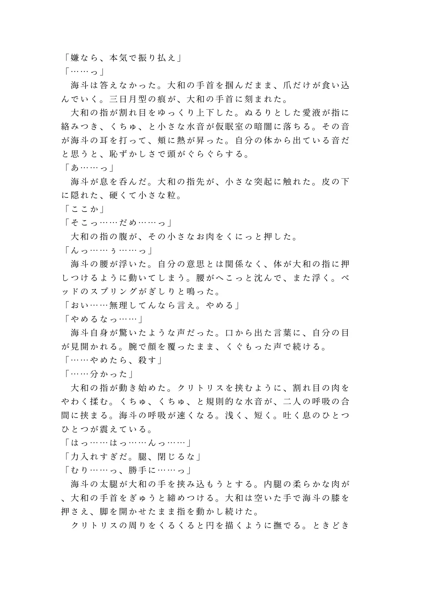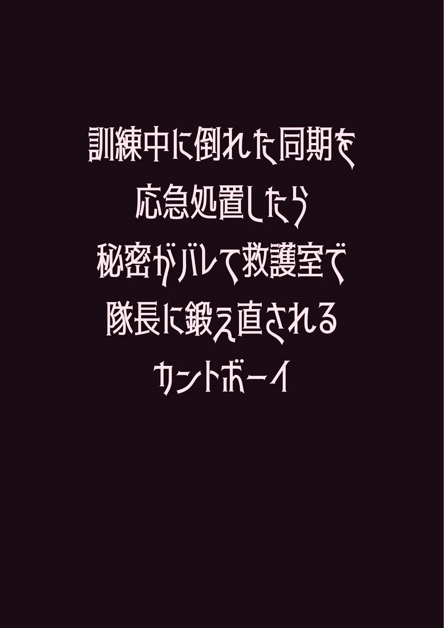 風呂場の見張り、消灯後の気配、訓練で背負われたときの心音。二人だけの共犯関係は、やがて海斗の体を目覚めさせていく。一度も使われたことのない場所が、大和の指先で初めて熱を知る。「やめたら、殺す」——プライドも理性もかなぐり捨てた海斗の懇願が、仮眠室の暗闇に溶けていく。