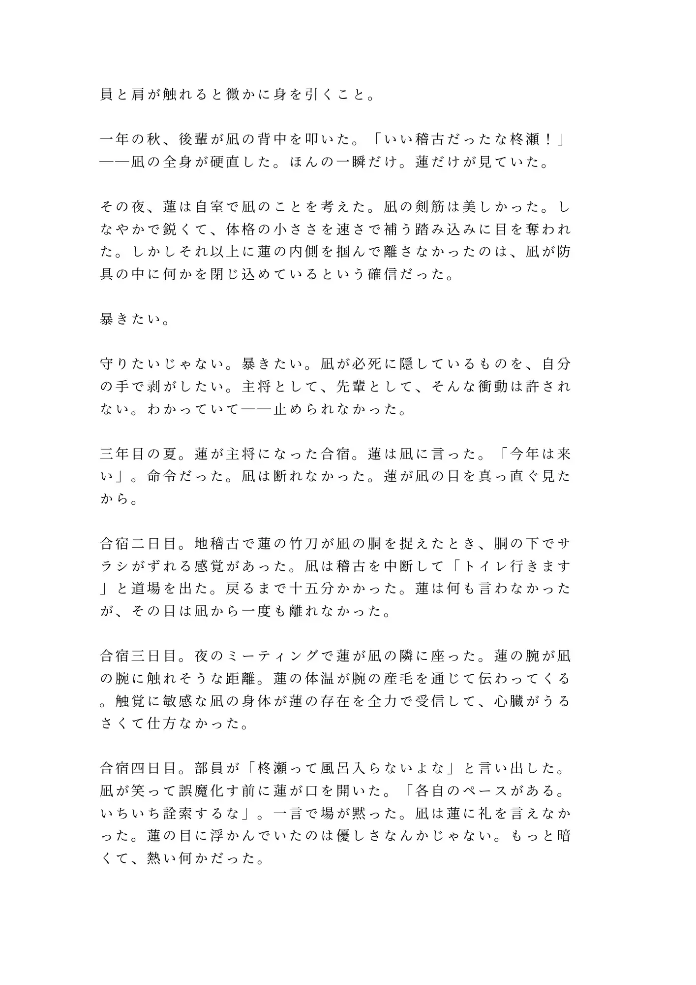 主将・鷹司蓮は、入部初日から凪の剣に目を奪われた男だ。しなやかで鋭い剣筋、体格差を速さで覆す踏み込み。しかし蓮が本当に惹かれたのは、凪が防具の奥に必死で隠している「何か」だった。守りたいのではない。暴きたい。二年間その衝動を飲み込み続けた蓮の理性が、合宿最終夜、凪の涙を見た瞬間に砕け散る。