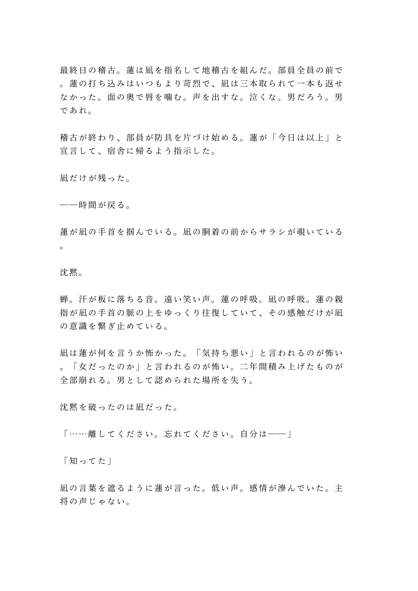 剣道場の熱気、竹刀が交わる衝撃、防具の内側に閉じ込めた秘密――すべてが暴かれる夜が来る。大学剣道部二年の柊瀬凪は、誰にも明かせない身体を防具の下に隠して竹刀を振り続けてきた。着替えは個室、風呂は一人、合宿は毎年辞退。「男でありたい」という切実な祈りだけを支えに、凪は道場に立ち続ける。