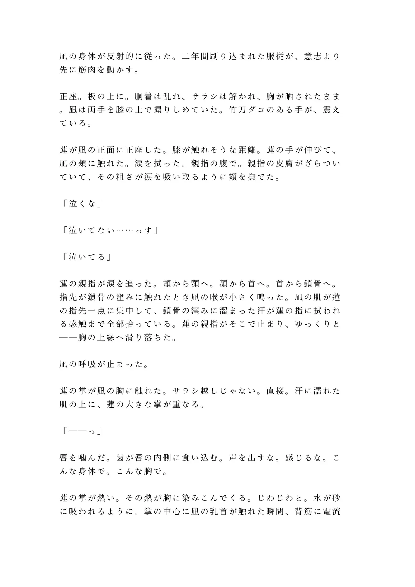 汗と涙で濡れた道場の板の上、解かれるサラシ、晒される素肌。「お前がそう言うなら、男だ」――凪の性自認をまっすぐに肯定しながら、その身体への剥き出しの渇望を隠さない蓮の言葉が、凪の心と身体を同時に貫く。