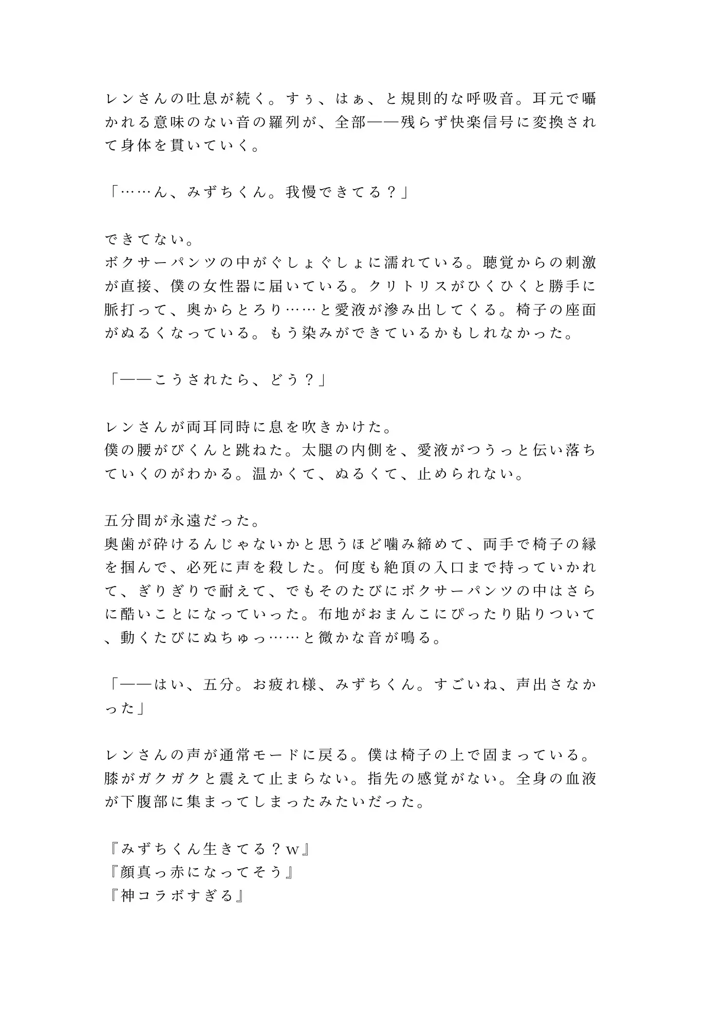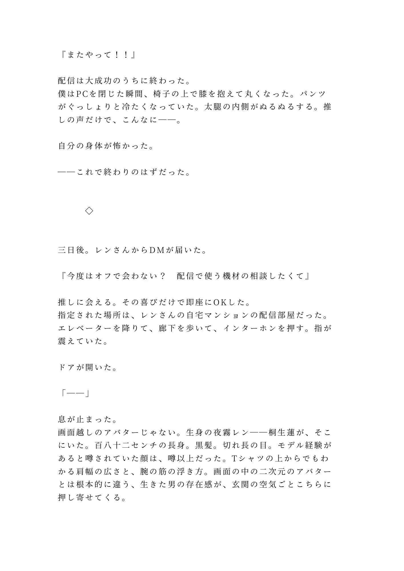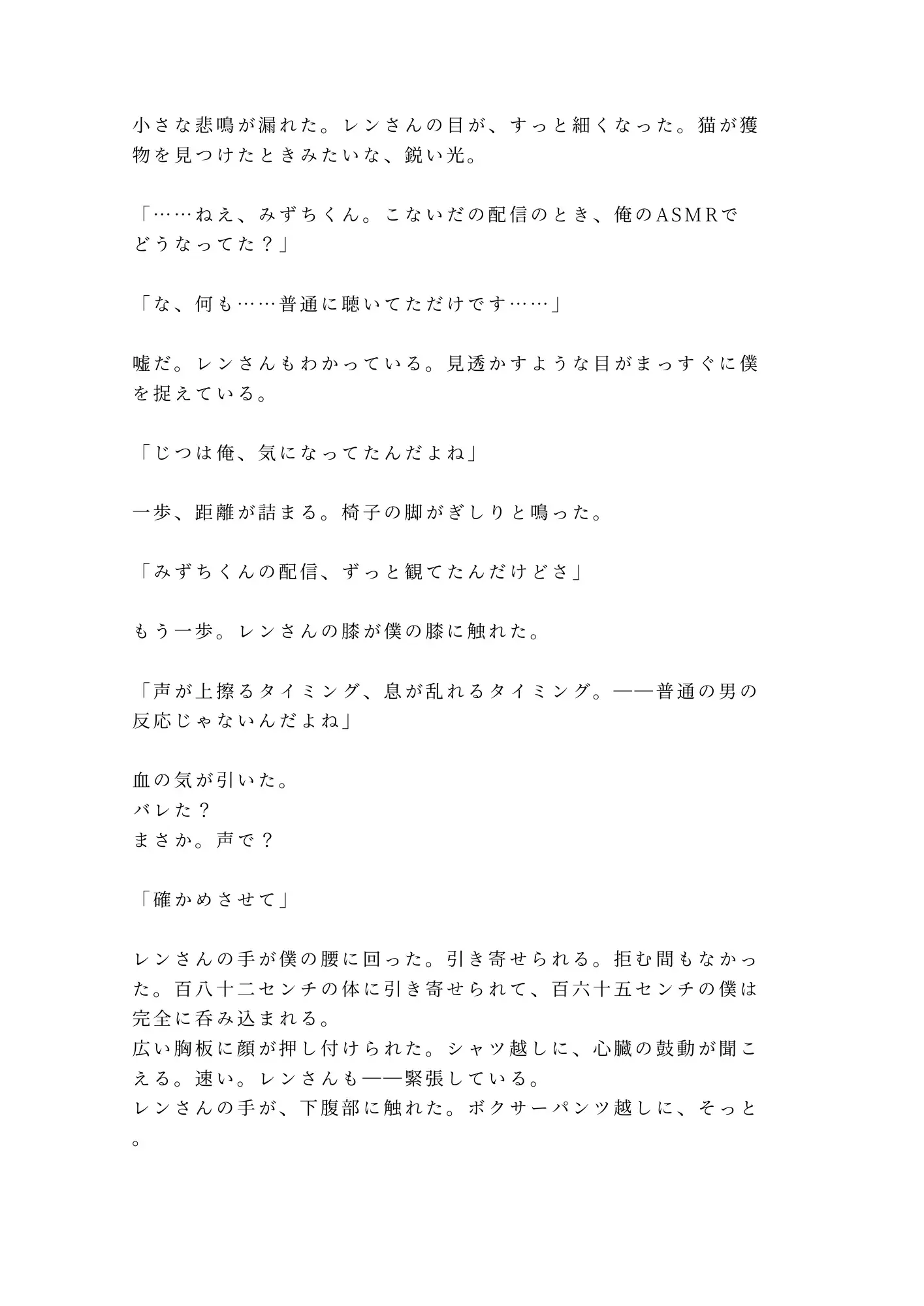 登録者わずか三千人のゲーム配信者・みずちには、誰にも明かせない秘密がある。戸籍上は男、見た目も声も男——けれど下半身には女性器を持つ「カントボーイ」であること。その秘密を押し隠したまま、登録者五十八万人の人気ASMR配信者・夜霧レンとのコラボ配信が決まってしまう。推しの低音ボイスがイヤホン越しに流れ込むだけで身体は正直に反応し、罰ゲームのASMR五分間耐久では声を殺すのが精一杯。画面の向こうのリスナーは「神コラボ」と沸いているが、画面の手前ではボクサーパンツの中がどうしようもないことになっていた。