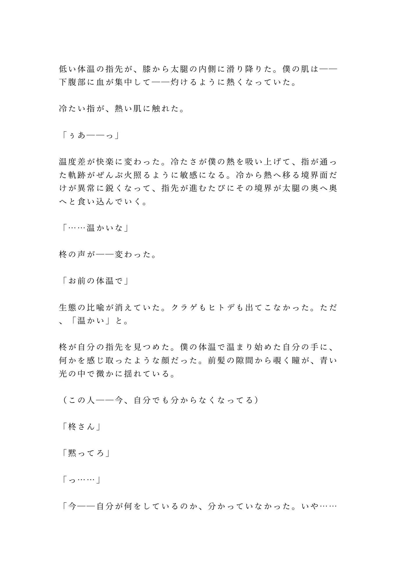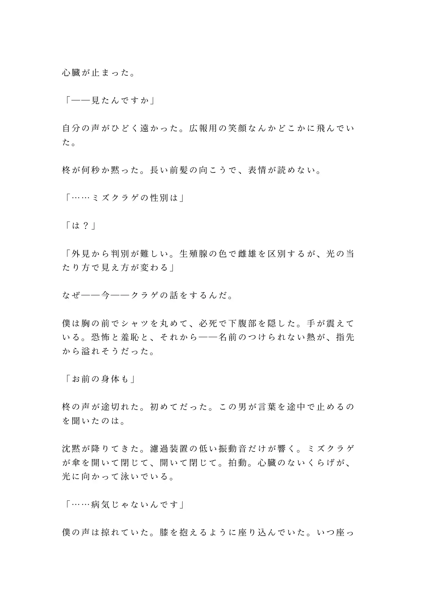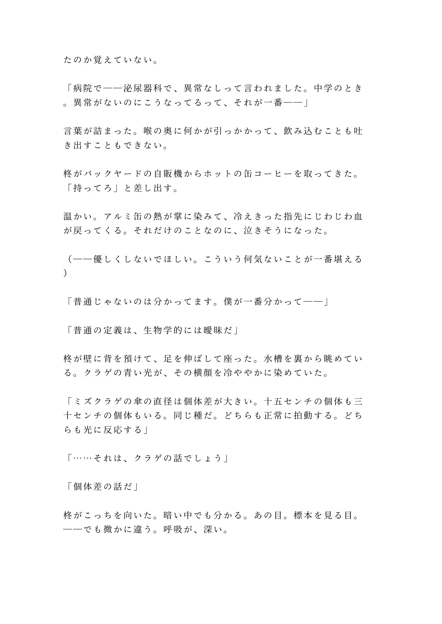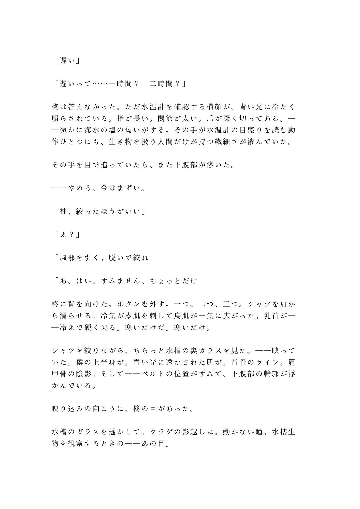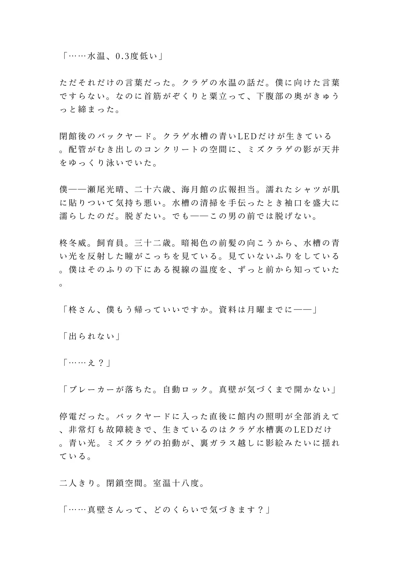 閉館後の水族館——停電で閉じ込められた二人きりの密室。クラゲ水槽のLEDだけが灯る青い闇の中で、広報担当の瀬尾光晴は、ずっと隠してきた秘密を無口な飼育員・柊冬威に暴かれていく。光晴は誰にも見せたことのない身体を持つカントボーイ。「異常なし」という診断が逆に彼を孤独にしてきた。けれど冬威は違った。同情も嫌悪もなく、ただ「個体差だ」と言い切る。何百何千の海洋生物を見つめてきた男の、静かで確かな目。その視線に、光晴の二十六年間の鎧が音もなく剥がれていく。