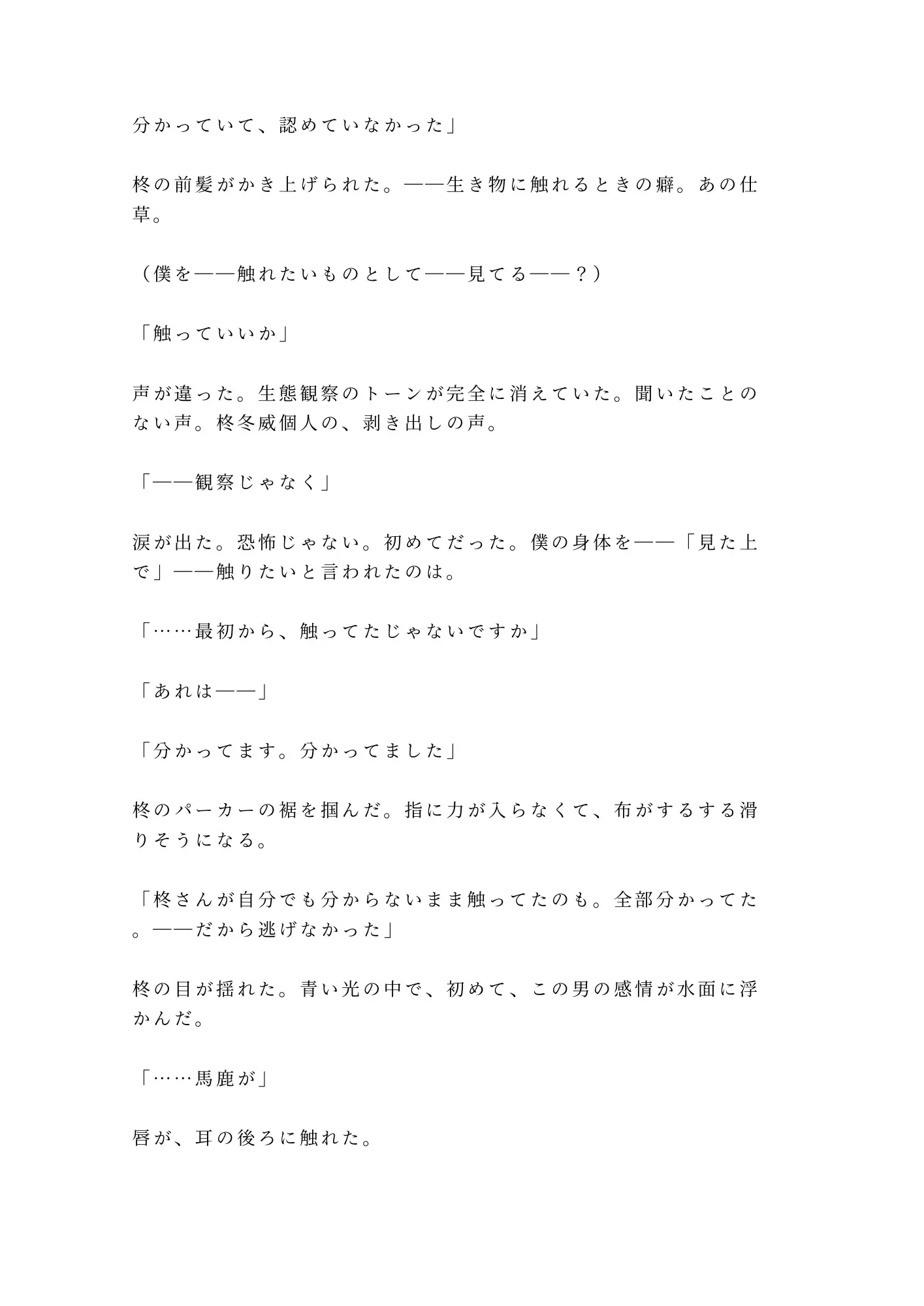 本作最大の魅力は、冬威というキャラクターの造形にある。寡黙で、感情の表し方を知らず、生き物の生態でしか気持ちを語れない不器用な男。クラゲやヒトデの話をしながら、その言葉の裏で確実に光晴の身体と心を暴いていく。科学者の冷静さが崩れる瞬間——「触っていいか。観察じゃなく」——この一言に至るまでの緊張感は、読んでいて息を忘れるほど。