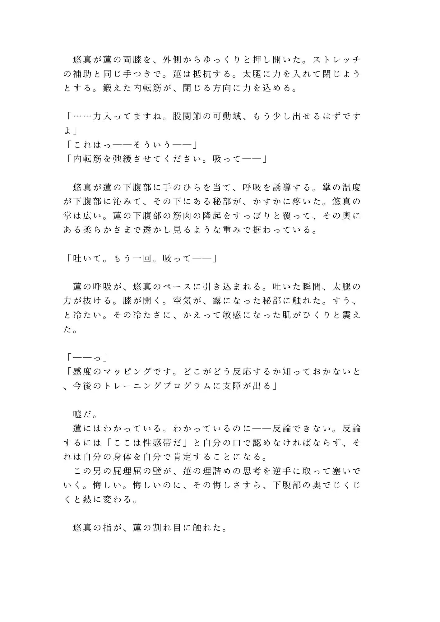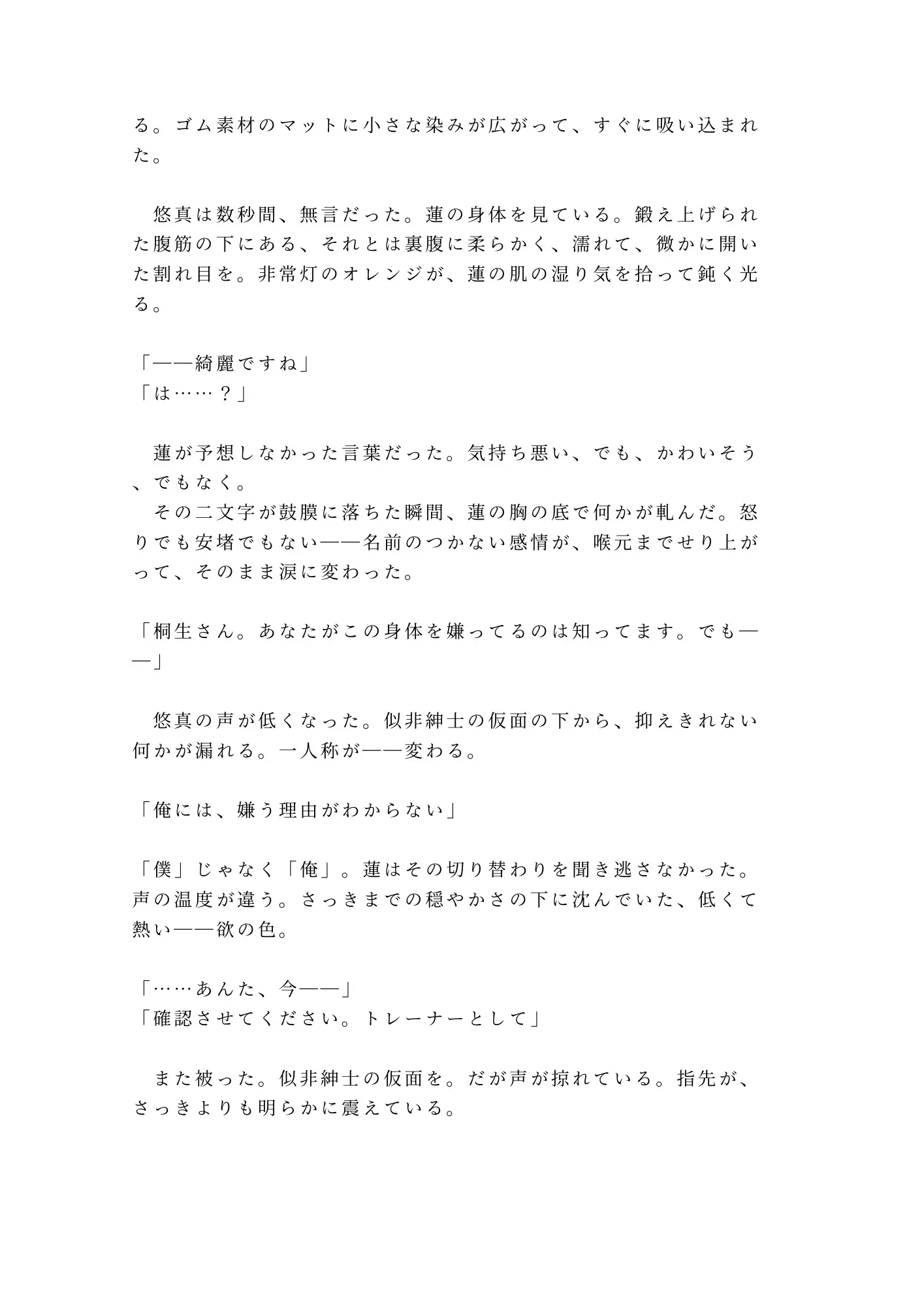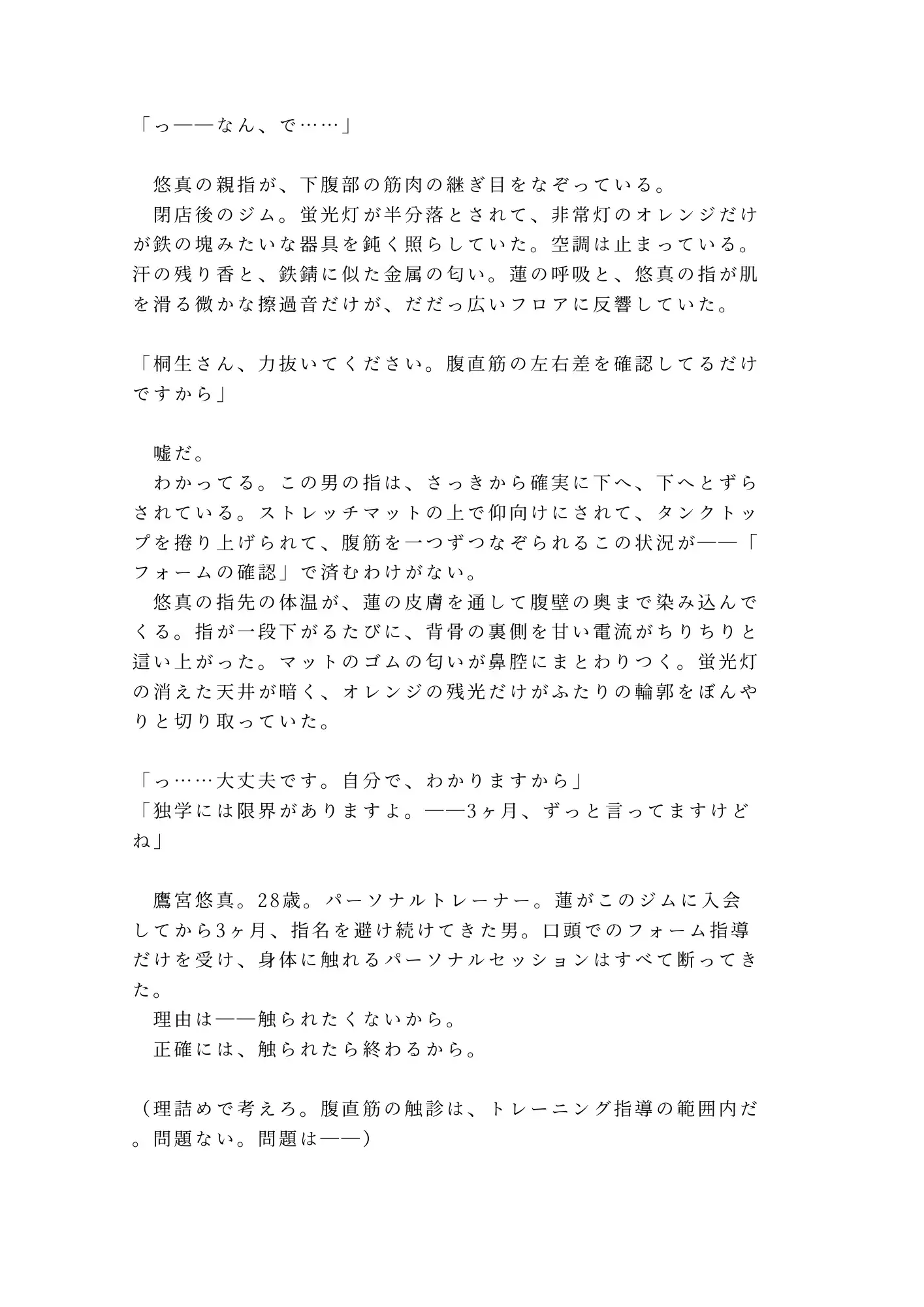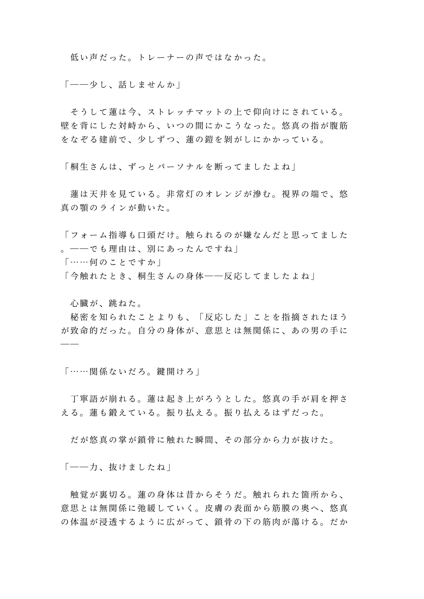 秘密を知られた絶望。けれど瀬尾の目に嫌悪はなく、その手はどこまでも温かかった。「こっちのトレーニングも、してやろうか」――トレーナーの口調のまま、冷静に、的確に、陽向の未開発の身体を拓いていく。