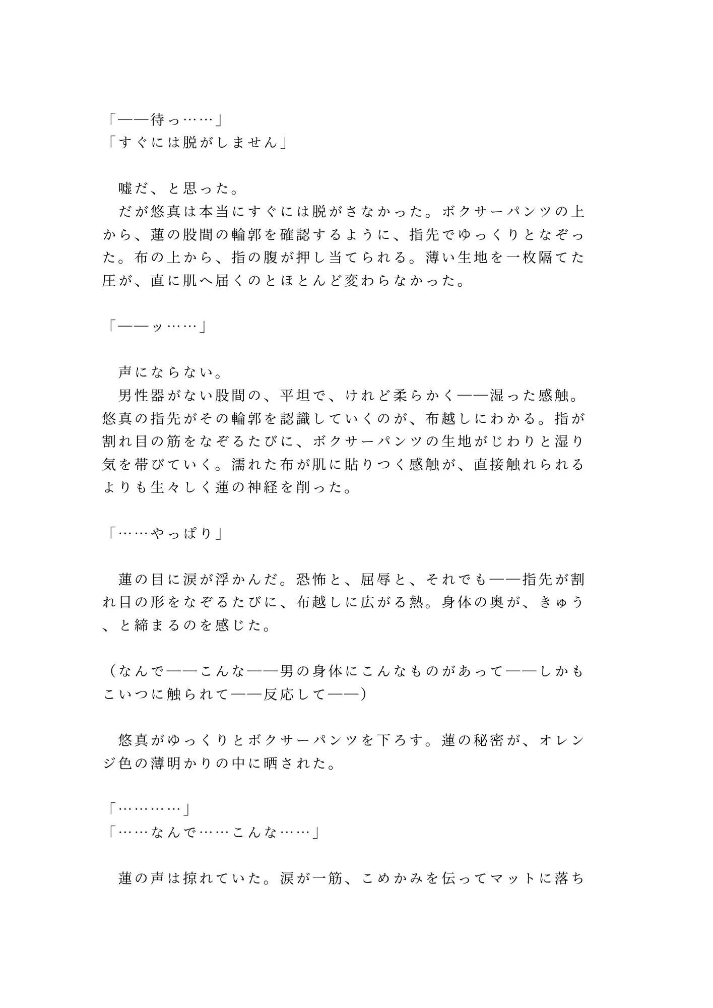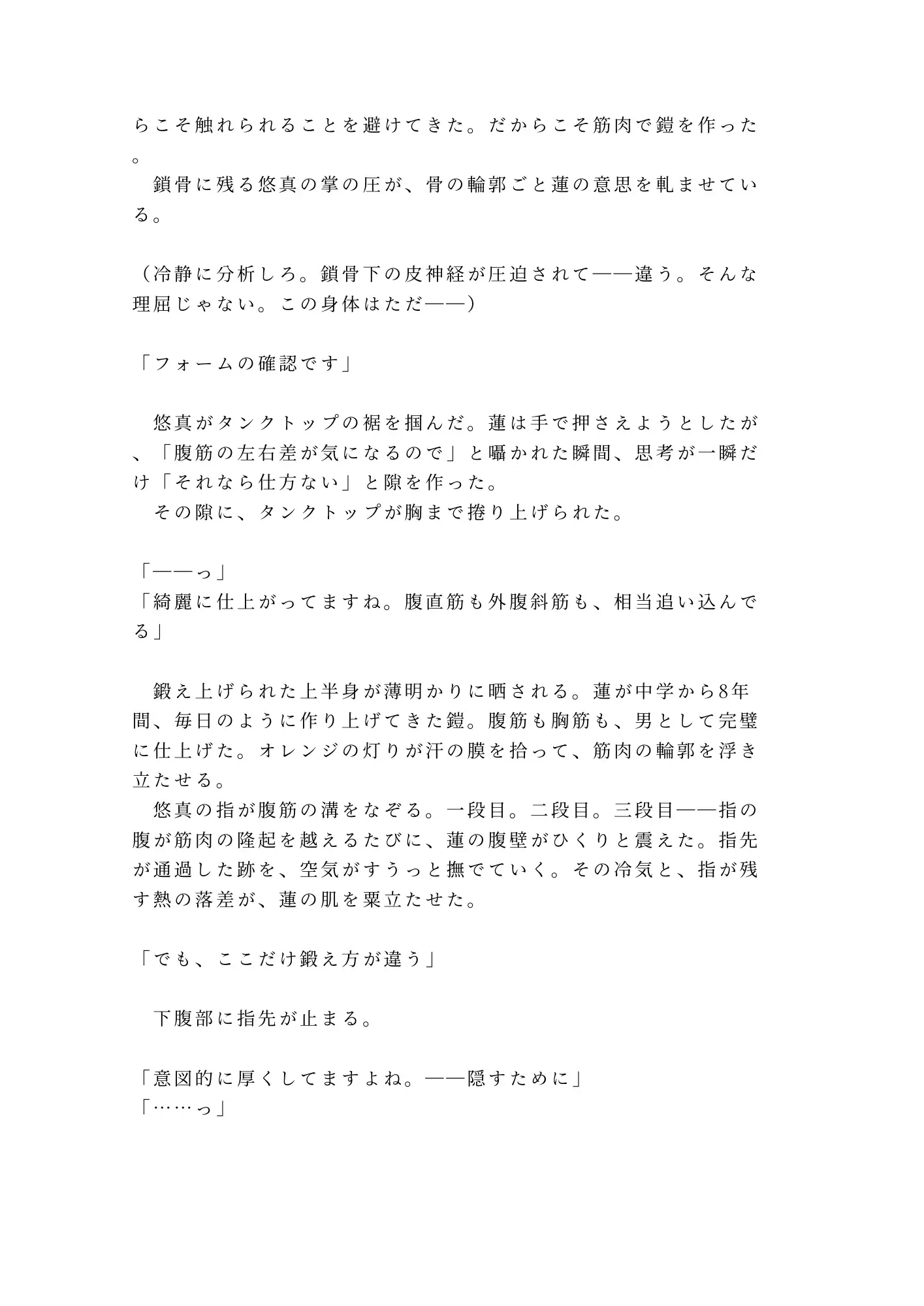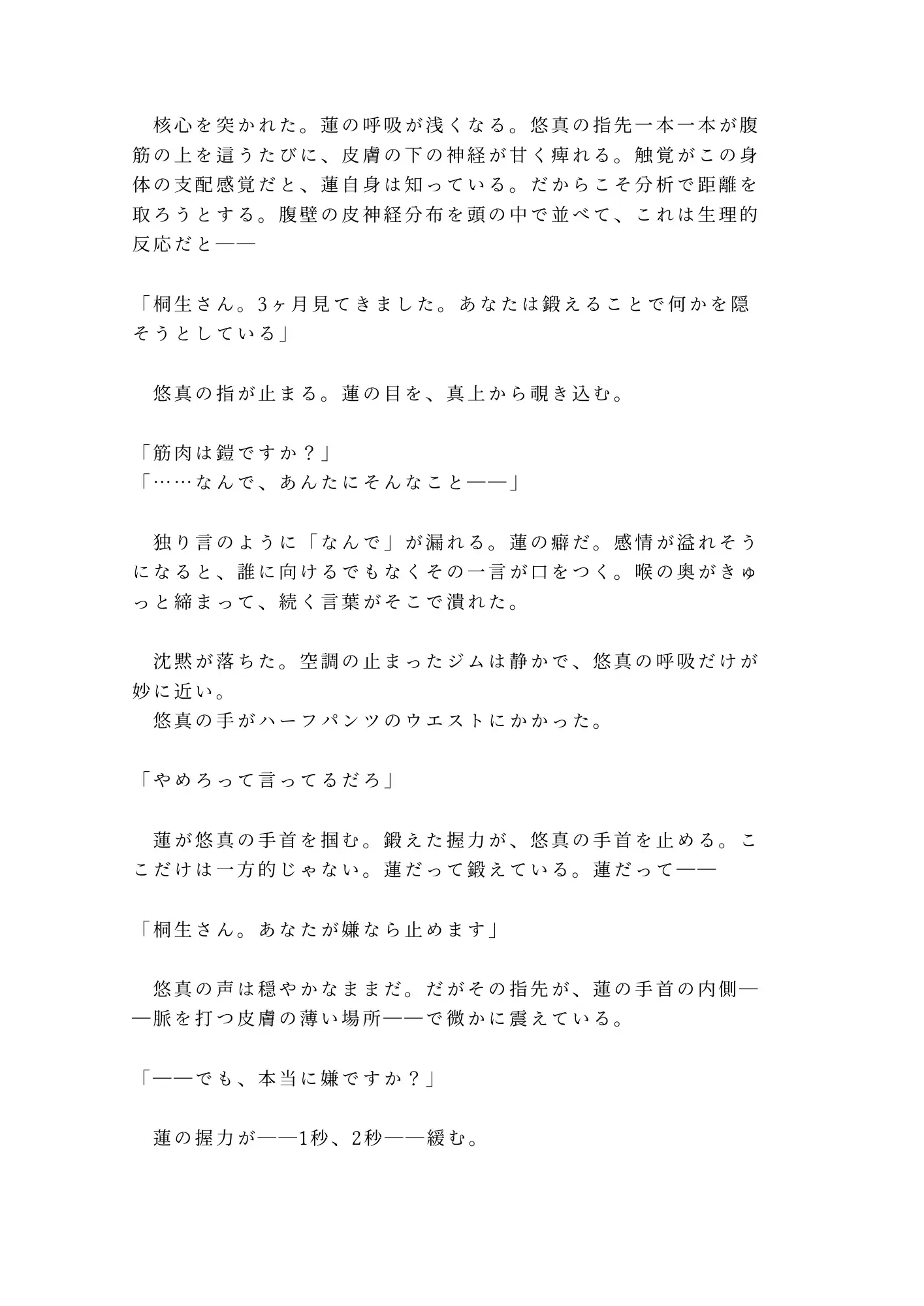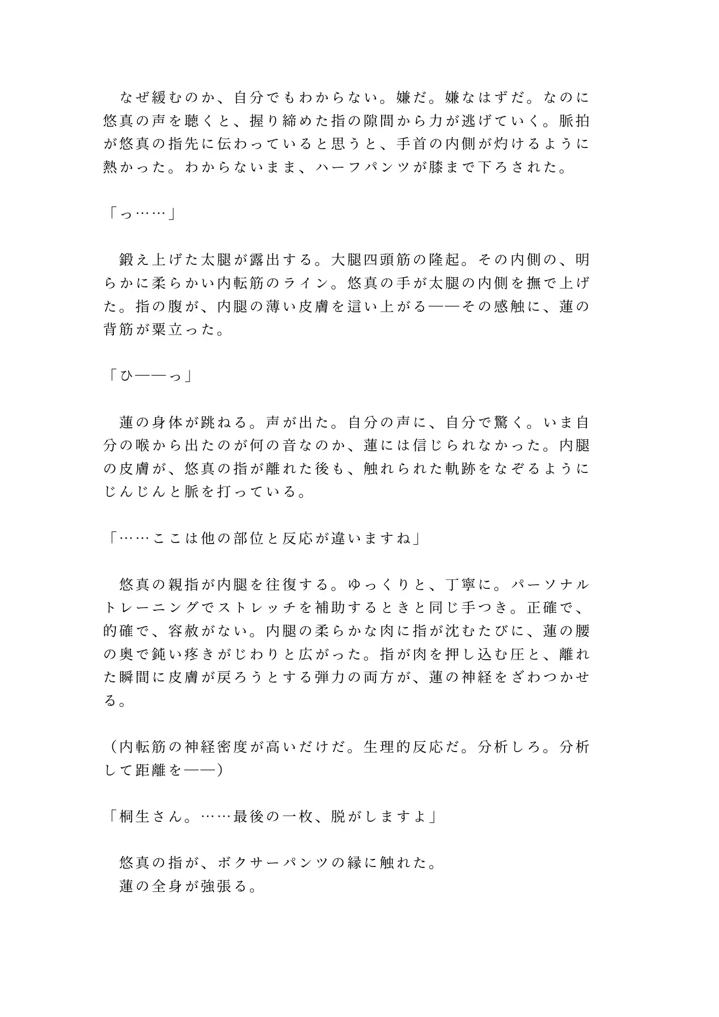 秘密を知られた絶望。けれど瀬尾の目に嫌悪はなく、その手はどこまでも温かかった。「こっちのトレーニングも、してやろうか」――トレーナーの口調のまま、冷静に、的確に、陽向の未開発の身体を拓いていく。
