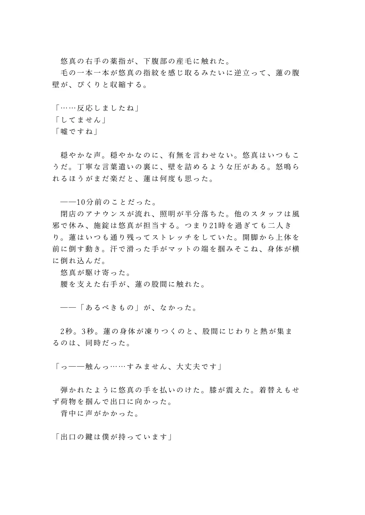 トレーナー×大学生 / 年上攻め / カントボーイ / 閉店後の密室 / 秘密バレ / 処女喪失 / 筋肉 / 体格差 / 中出し / 社会人