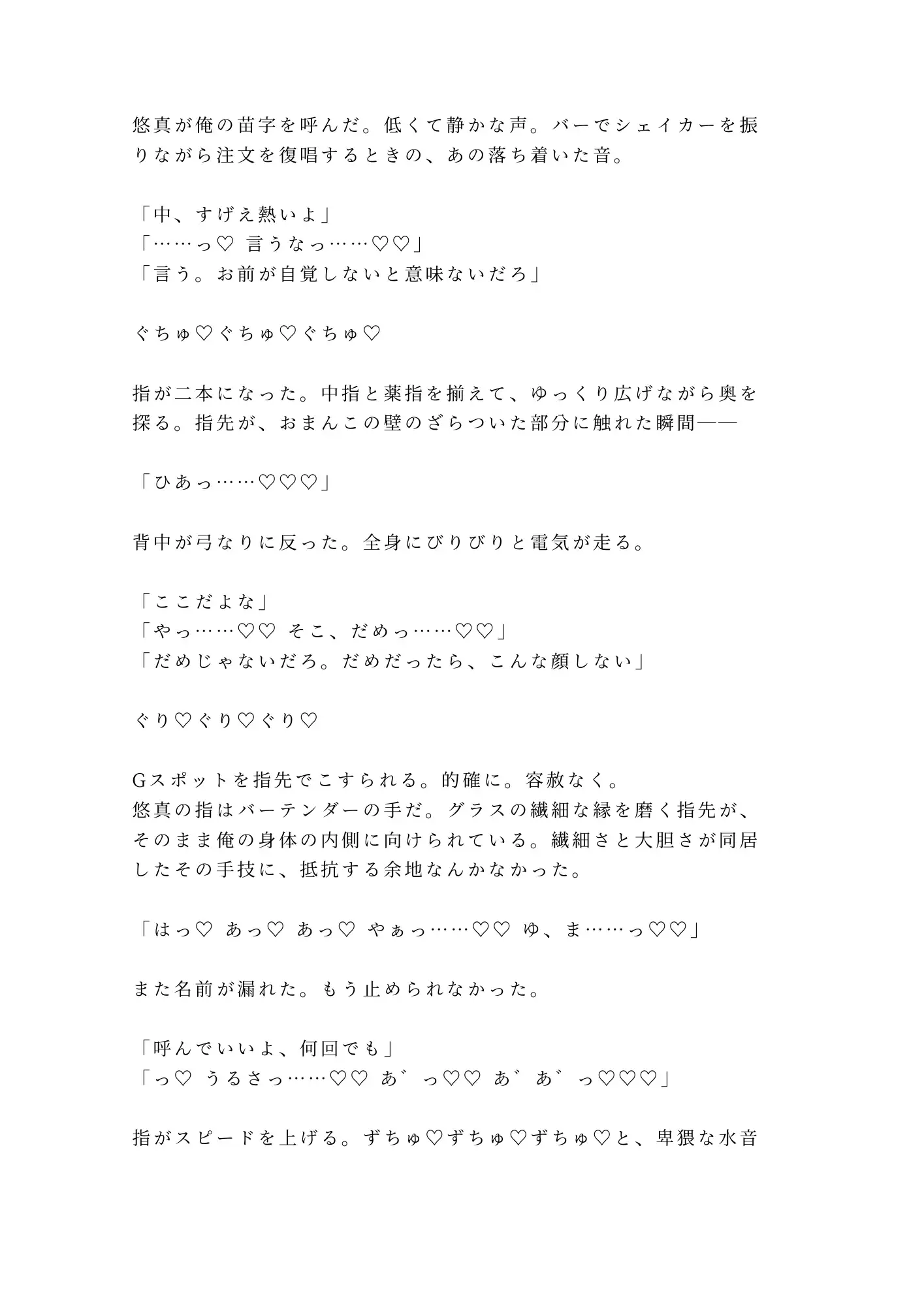 酔った夜の過ちから始まった関係は、気づけば三ヶ月。悠真の指は宮瀬の身体の地図を完璧に覚え、どこに触れれば声が漏れるか、どの角度で抵抗が崩れるかを知り尽くしている。グラスの縁を磨くバーテンダーの繊細な手が、宮瀬の内側を暴くたび、「セフレ」という言葉の輪郭が曖昧になっていく。