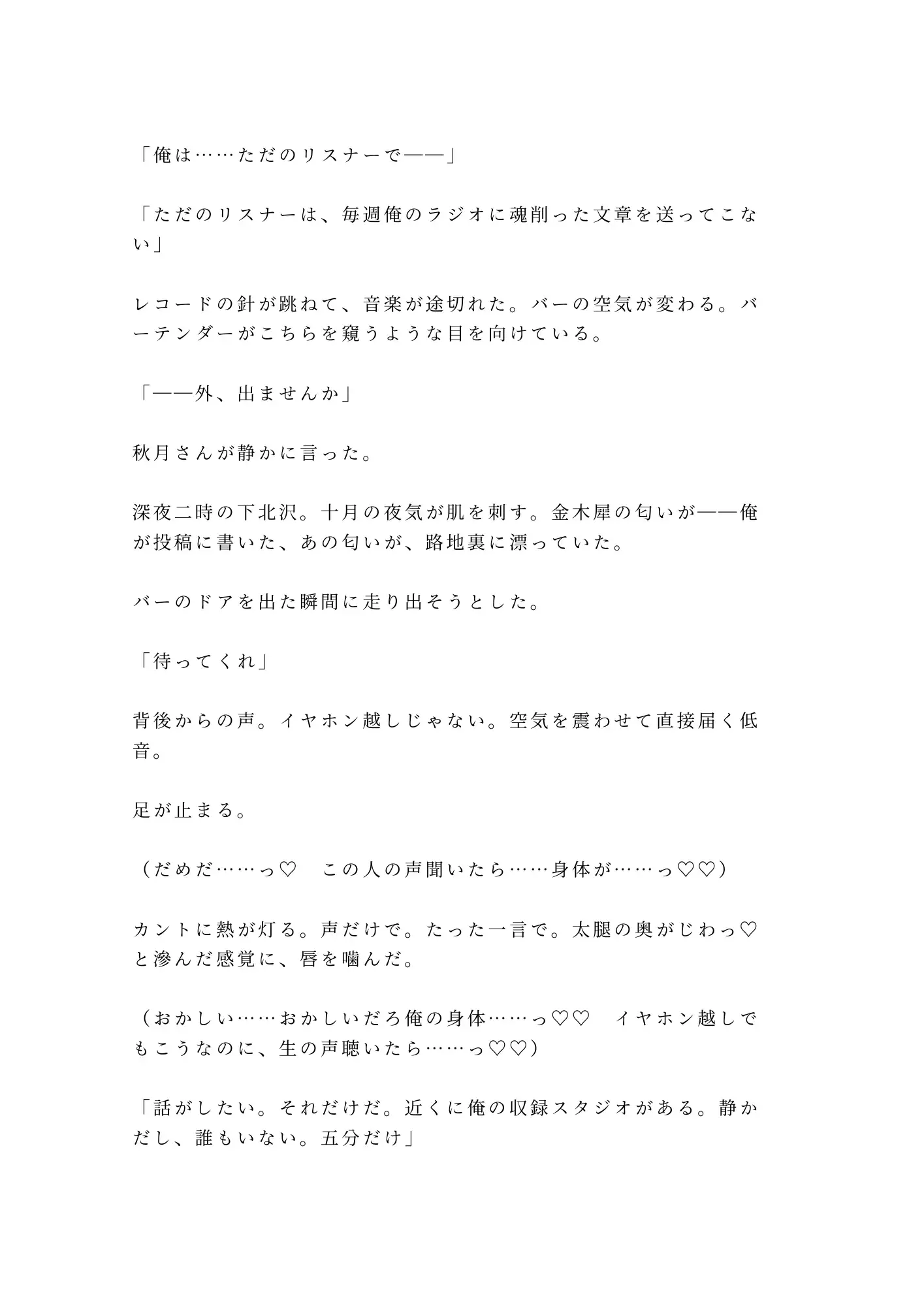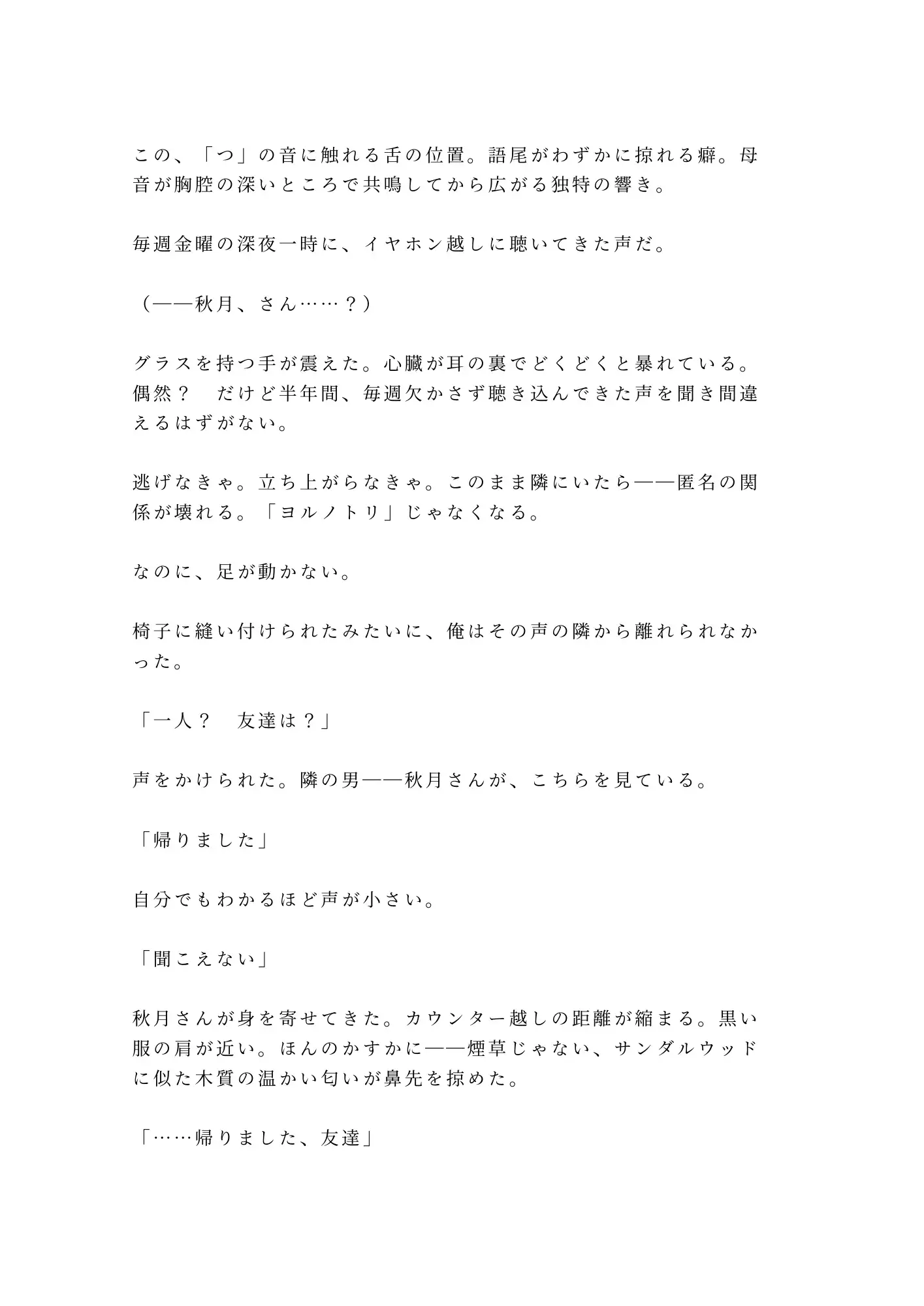 毎週金曜の深夜一時、匿名ラジオに投稿を送り続ける大学生・ヨルノトリ。画面の向こうのパーソナリティ・秋月悠真の低音は、彼にとって中毒だった。声を聴くだけで身体の奥が疼き、下着が濡れていく——男であるはずの自分の身体が、この人の声にだけ甘く裏切る。偶然の再会は、深夜の下北沢。バーのカウンターで隣に座った男の声が、イヤホンの中の声と重なった瞬間、匿名の殻が音を立てて軋み始める。スマホの画面から正体がバレ、逃げ出そうとした手首を掴んだ秋月の指は、想像よりもずっと熱かった。