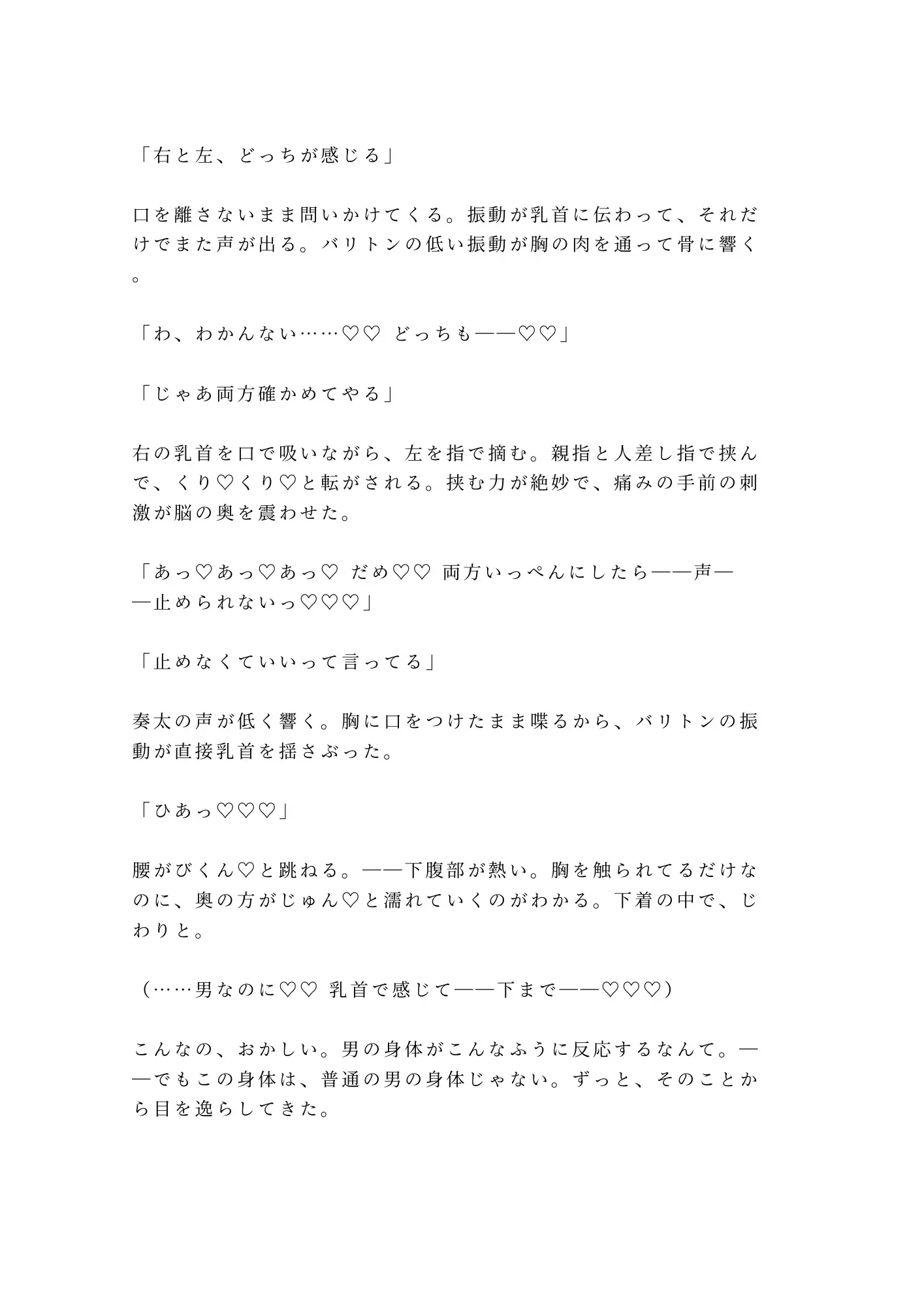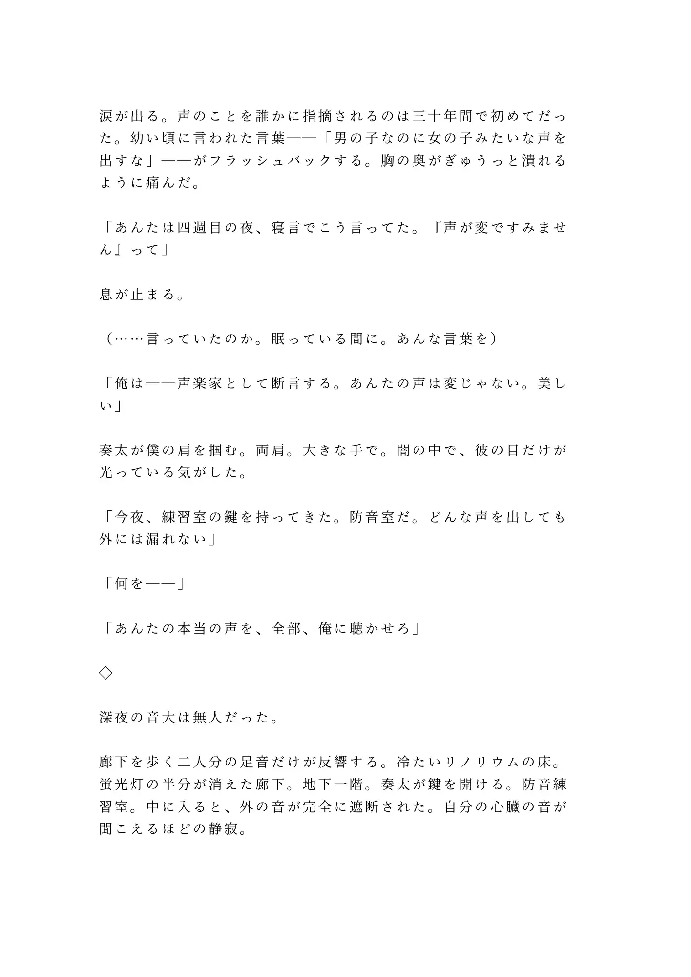 深夜の音大、防音練習室。ピアノの和音に導かれ、律の喉から解き放たれる声。三十年間封じてきた、高くて甘い、どこにも分類できない声。そして声と一緒に曝け出される身体の秘密——。