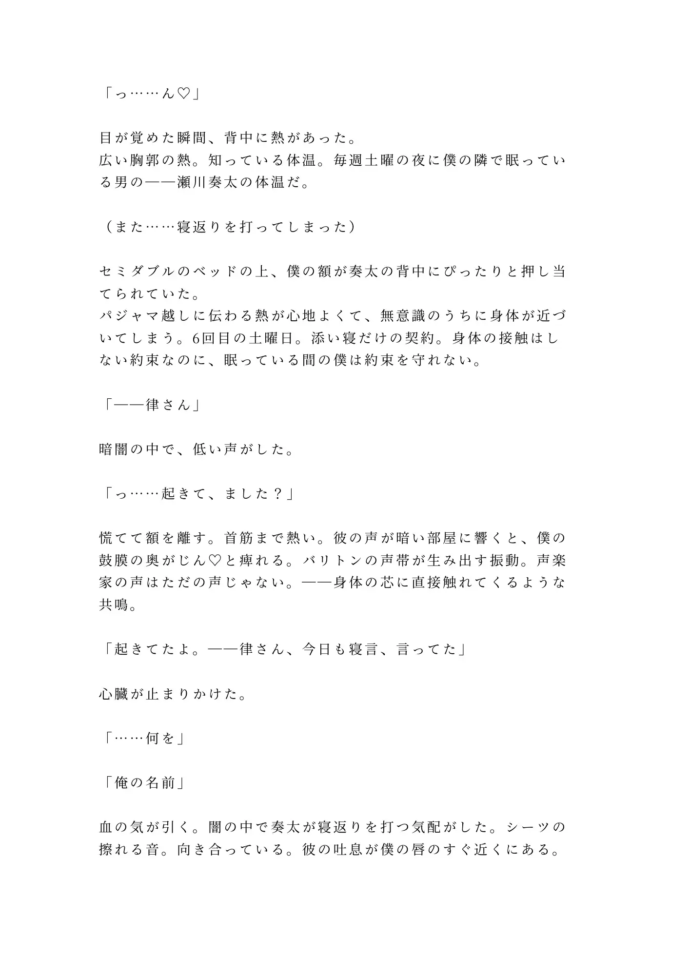 「声が変ですみません」——三十年間、自分の声を殺して生きてきた男が、声楽家の隣で眠る夜に、すべてを暴かれる。図書館司書の律は、不眠症の治療として始めた「添い寝契約」で、声楽家・瀬川奏太と毎週土曜の夜を過ごしていた。身体の接触はしない約束。ただ隣で眠るだけ。——それなのに、眠りの中の律は正直だった。寝返りで額を押しつけ、寝言で彼の名を呼び、起きている間は決して出さない「本当の声」を漏らしてしまう。