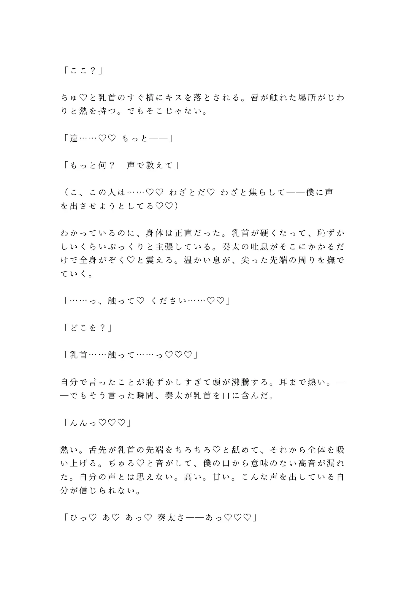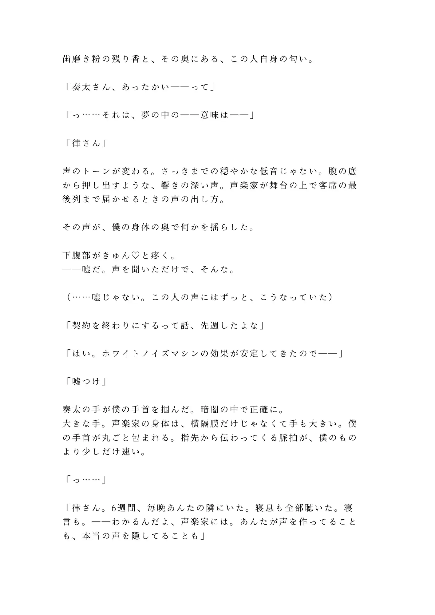 奏太は声楽家だ。声の専門家。寝息に混じる倍音の秘密も、喉を締めて作った低い声の嘘も、五週間の夜を重ねるうちにすべて聴き取っていた。そして六度目の土曜の夜、契約の終了を切り出した律に、奏太は告げる。「あんたの本当の声を、全部、俺に聴かせろ」と。
