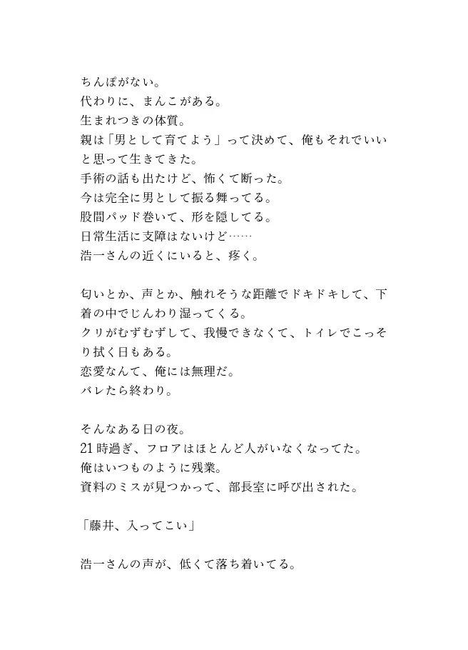 筋肉質で頼りがいのある新入社員・藤井亮は、生まれつきの秘部を隠して男として生きてきた。